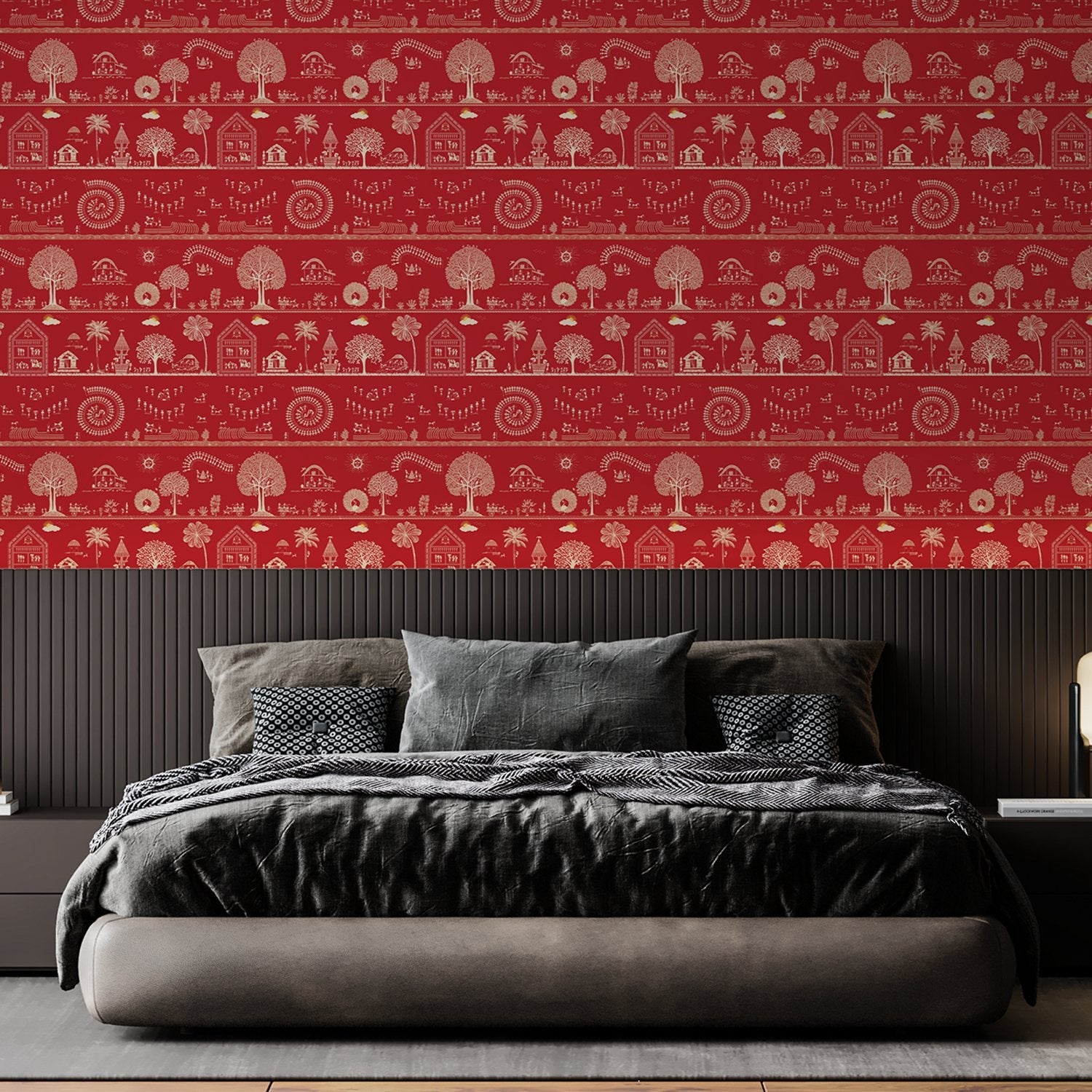 Match with Furniture and Decor: Ensure your wallpaper compliments your furniture, and the choice of other furnishings around your space. If you have a lot of real wooden elements in your room, Warli art with earthy tones can enhance this rustic vibe.