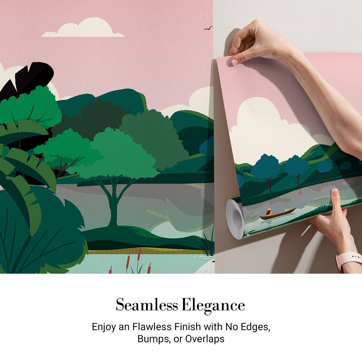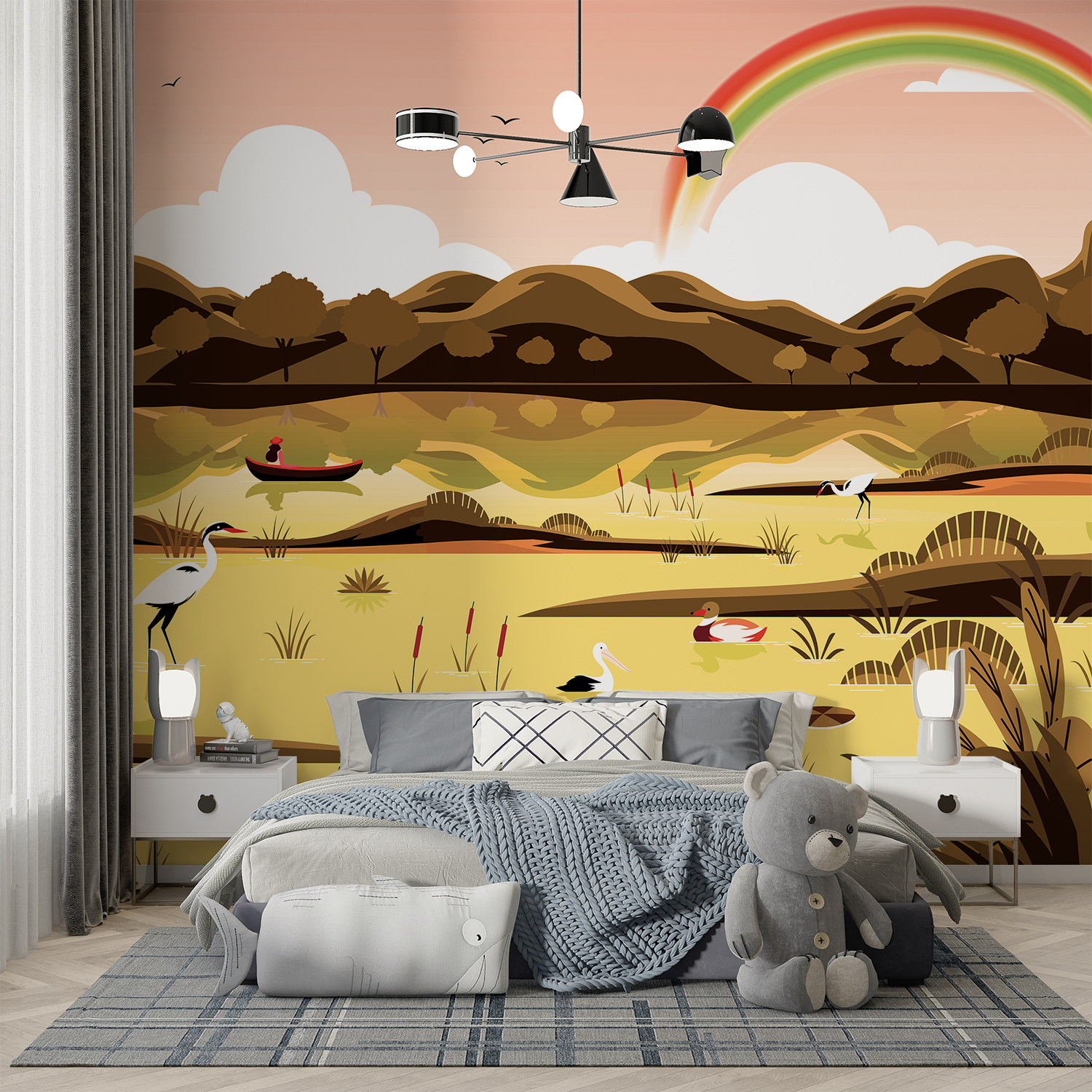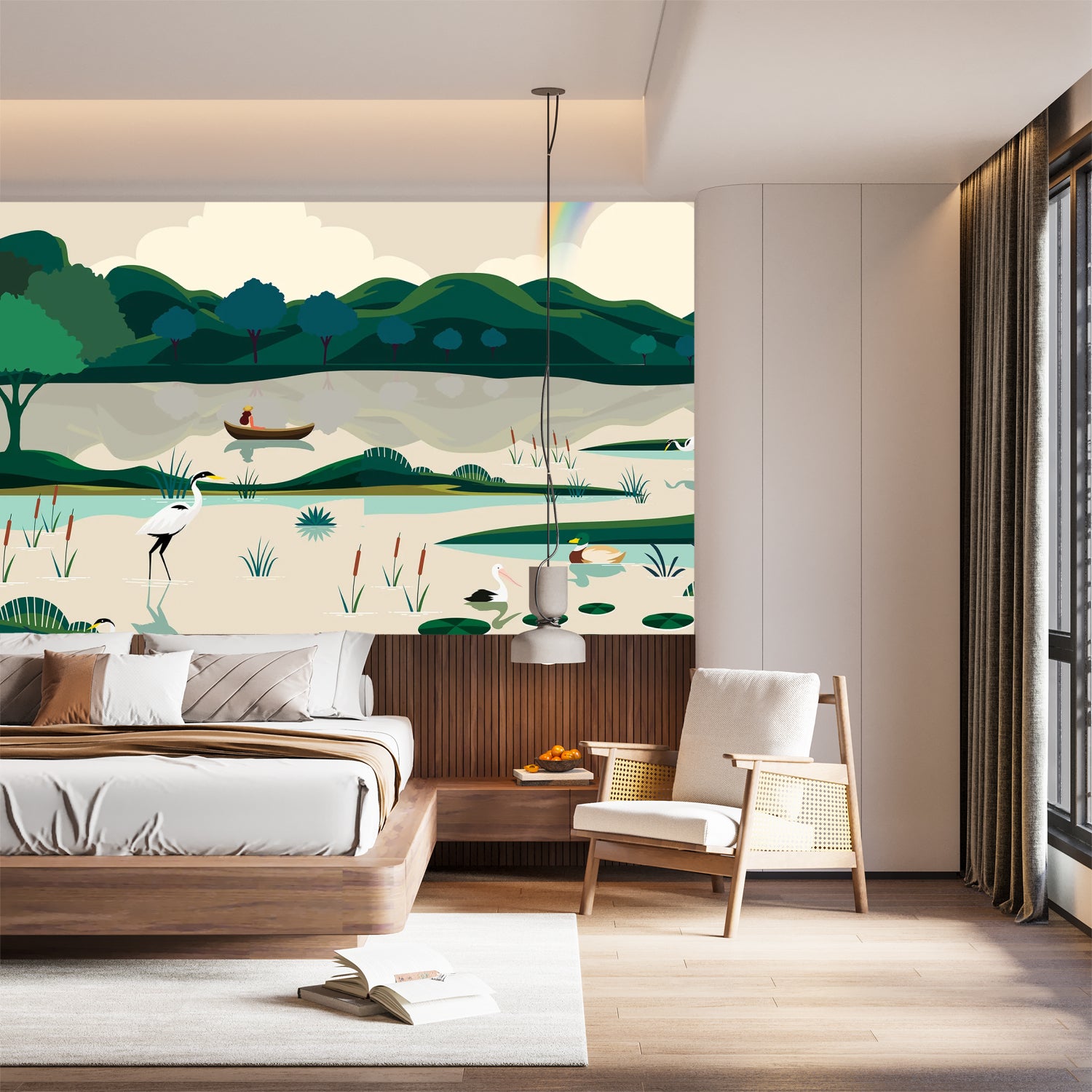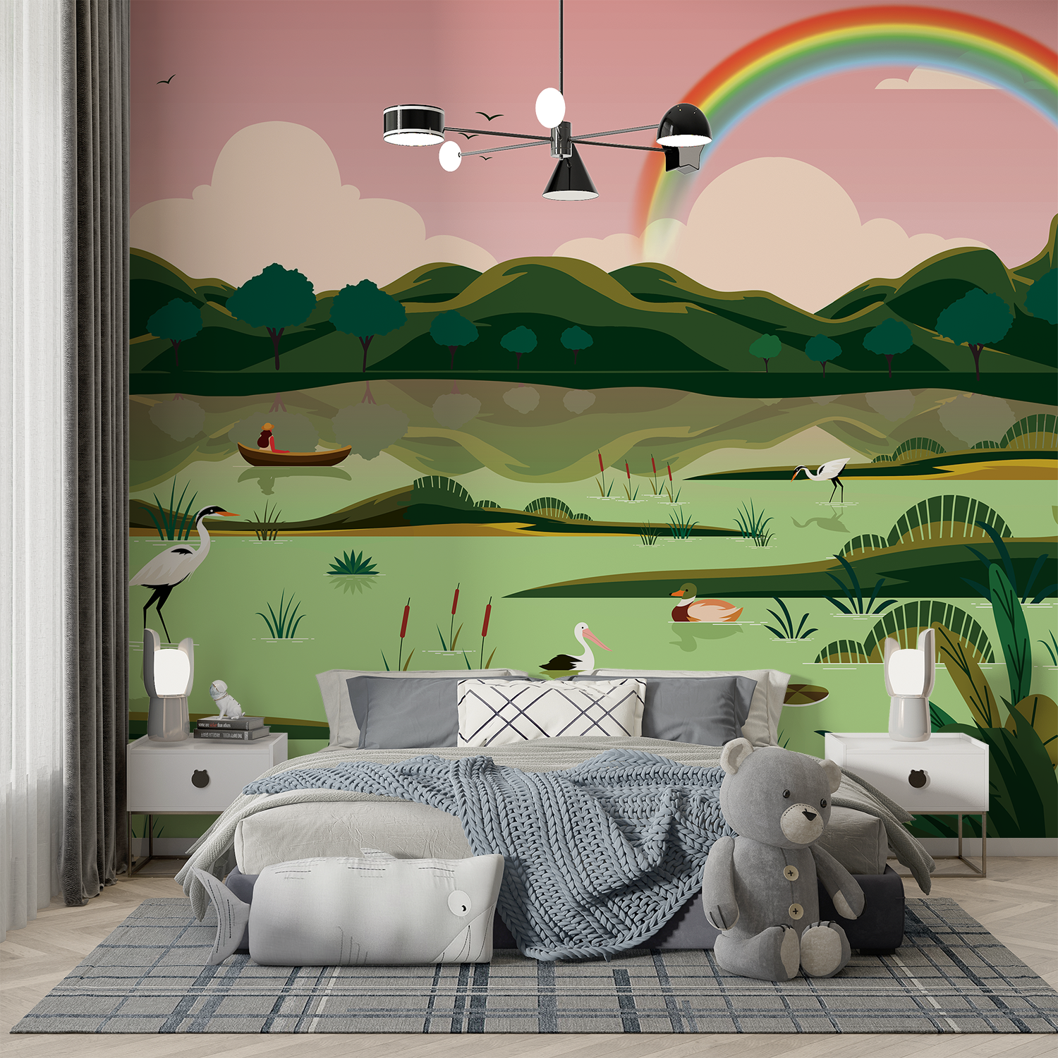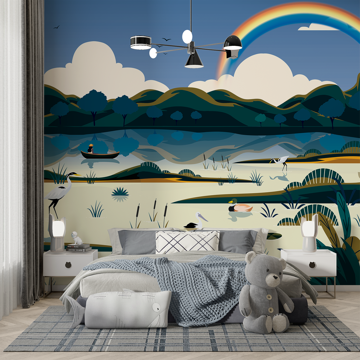 Transform your space with this serene lakeside wallpaper, featuring calm waters, lush greenery, and a rainbow-lit sky. Ideal for living rooms, bedrooms, or relaxation areas, it creates a peaceful ambiance and brings nature indoors. Perfect for those seeking tranquility and charm in their decor.