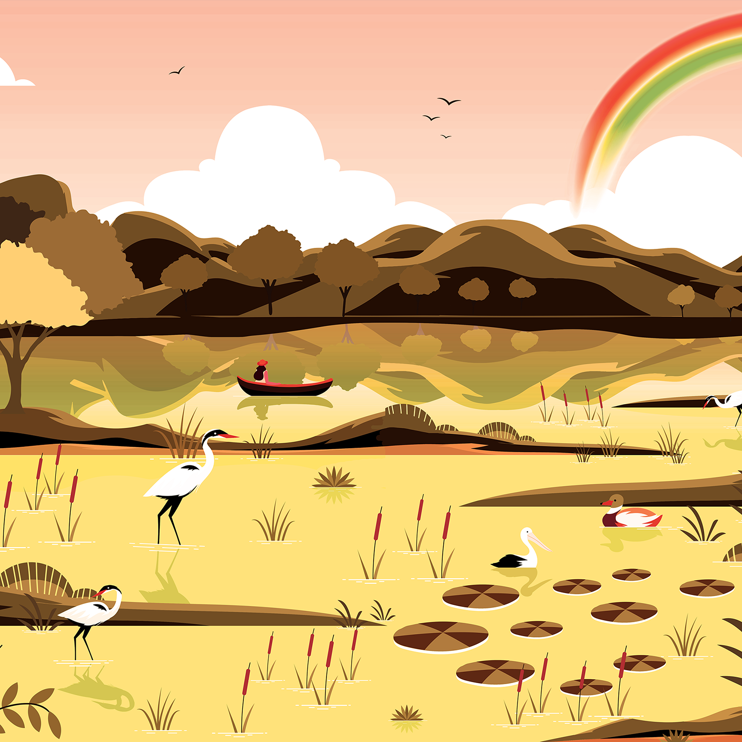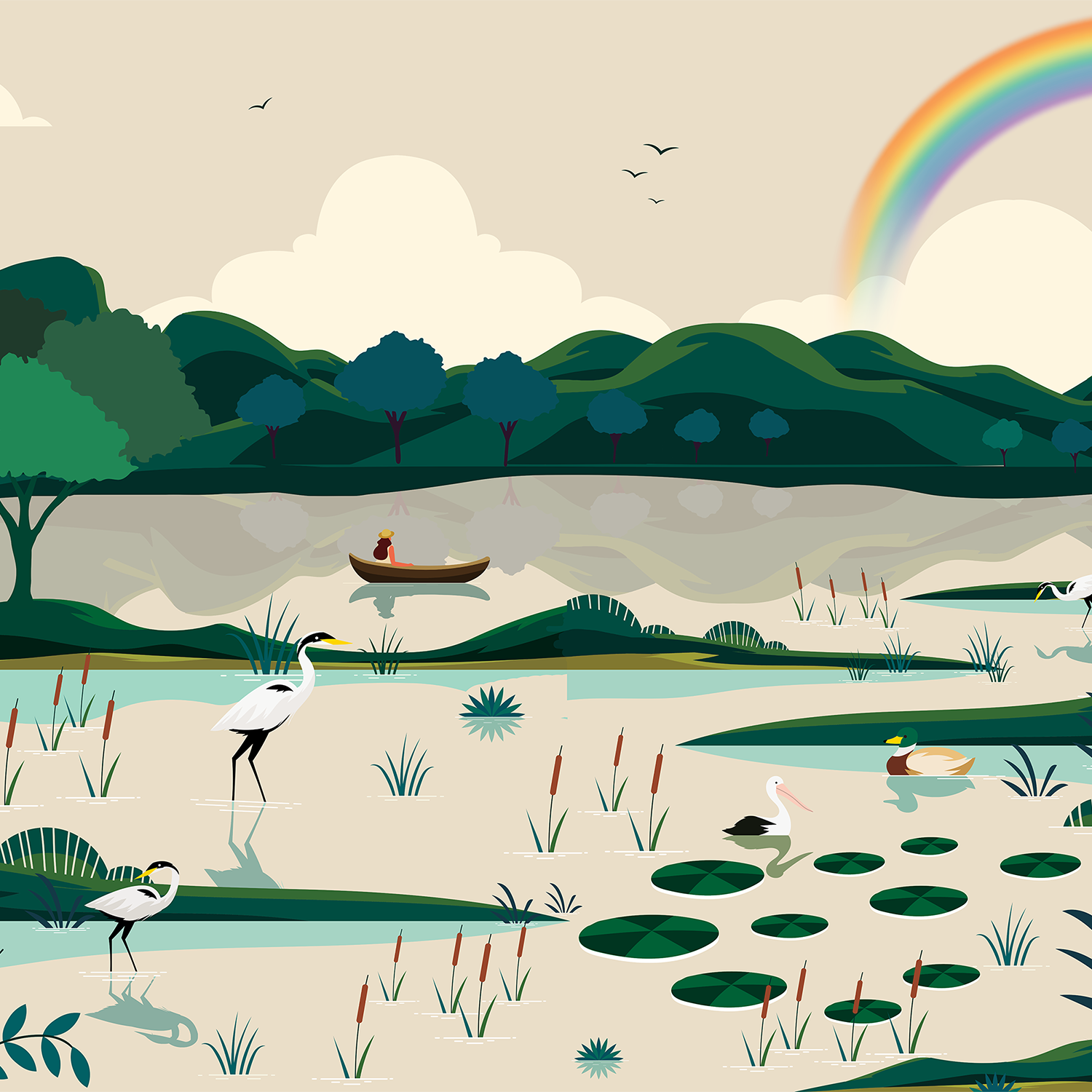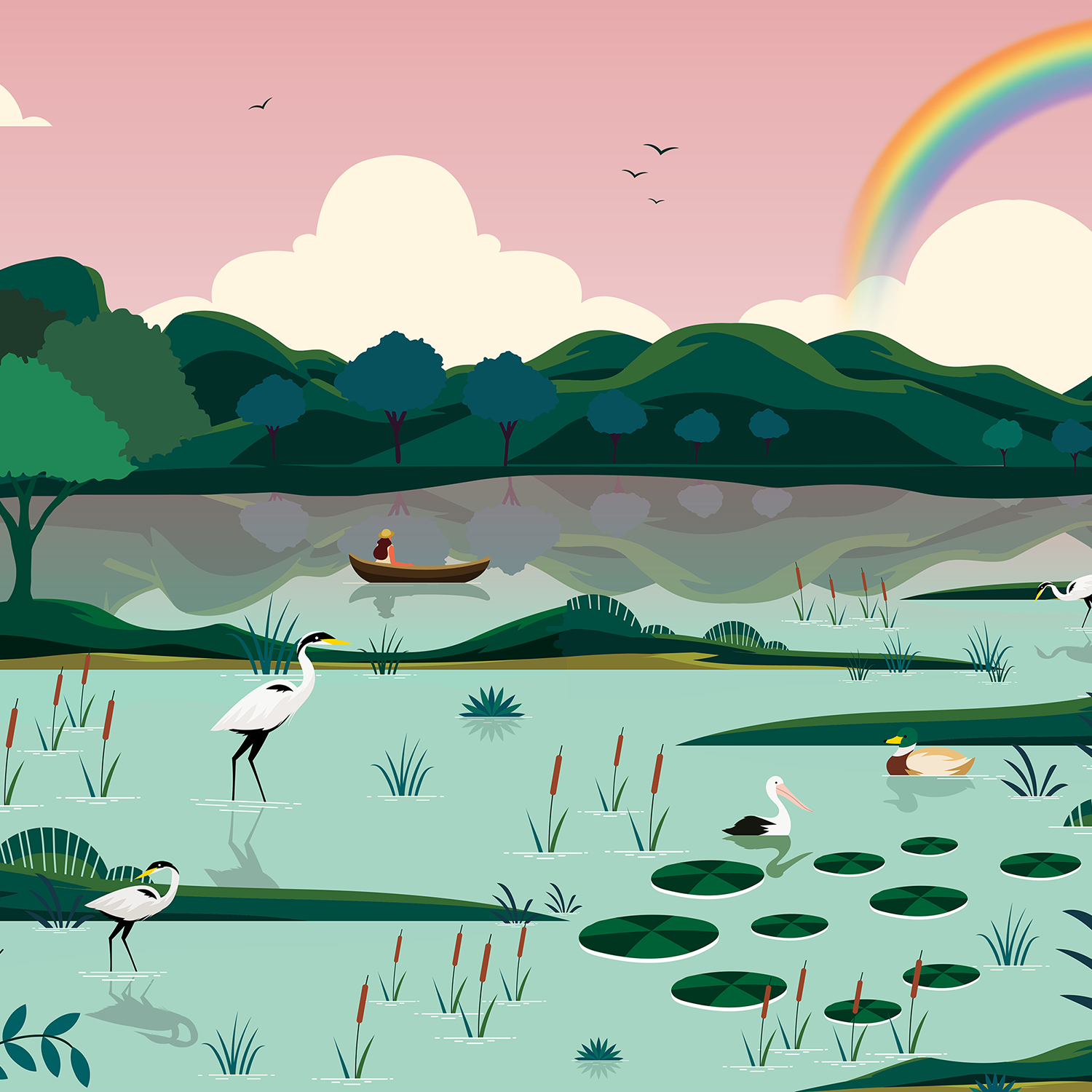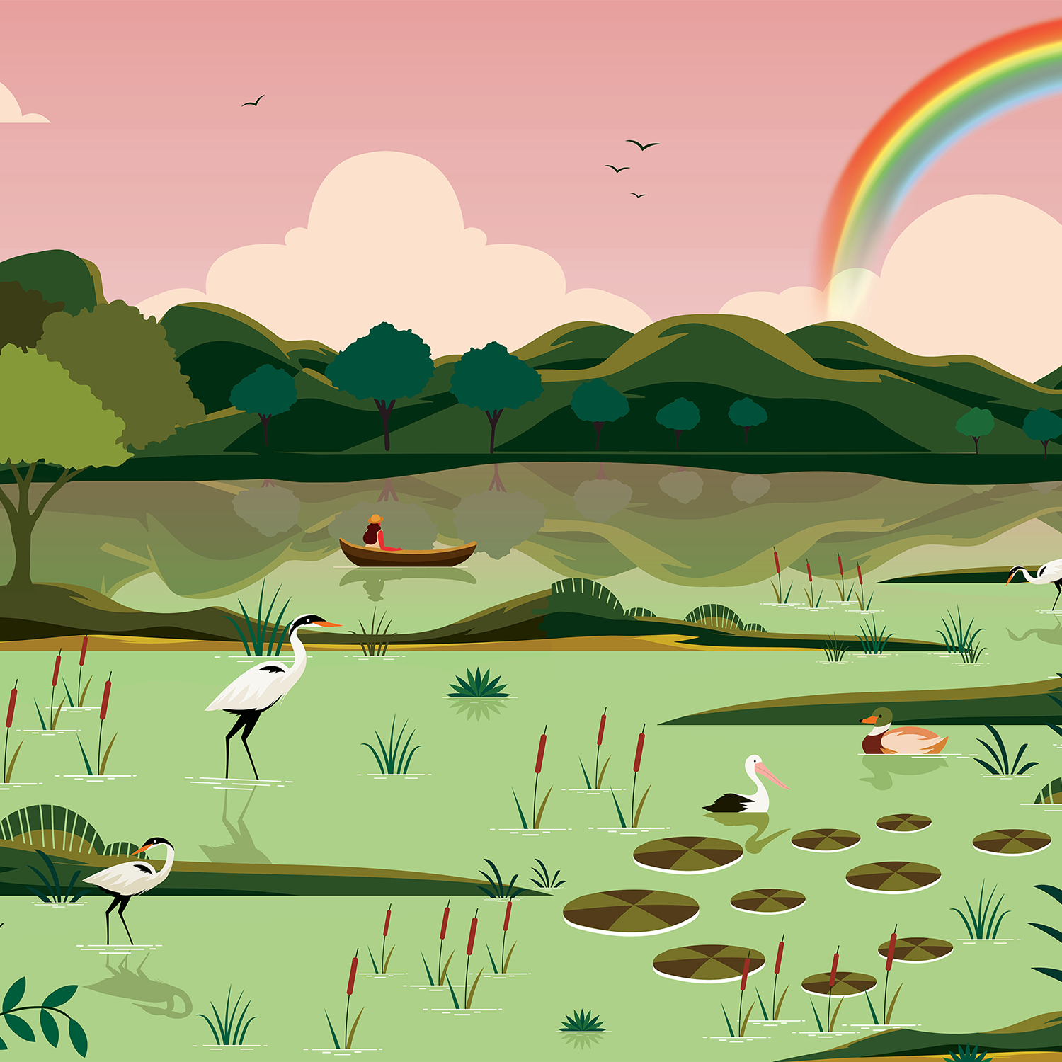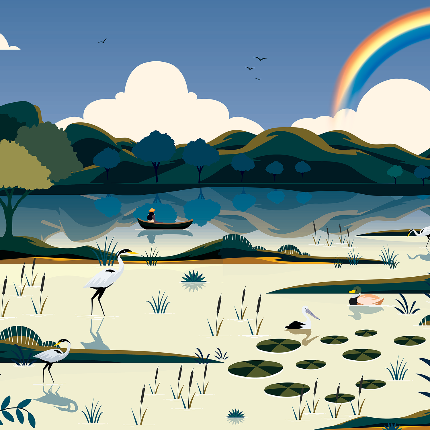 Transform your space with this serene lakeside wallpaper, featuring calm waters, lush greenery, and a rainbow-lit sky. Ideal for living rooms, bedrooms, or relaxation areas, it creates a peaceful ambiance and brings nature indoors. Perfect for those seeking tranquility and charm in their decor.