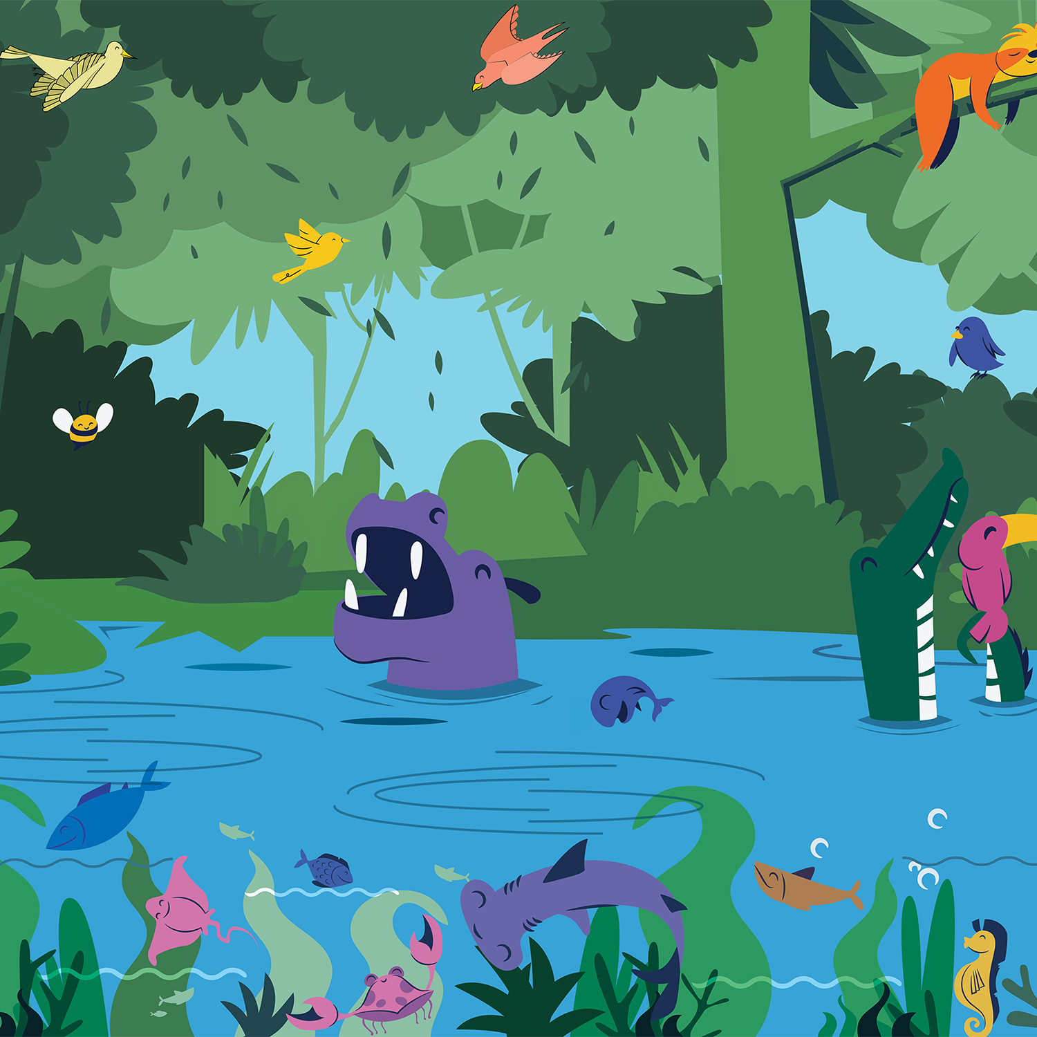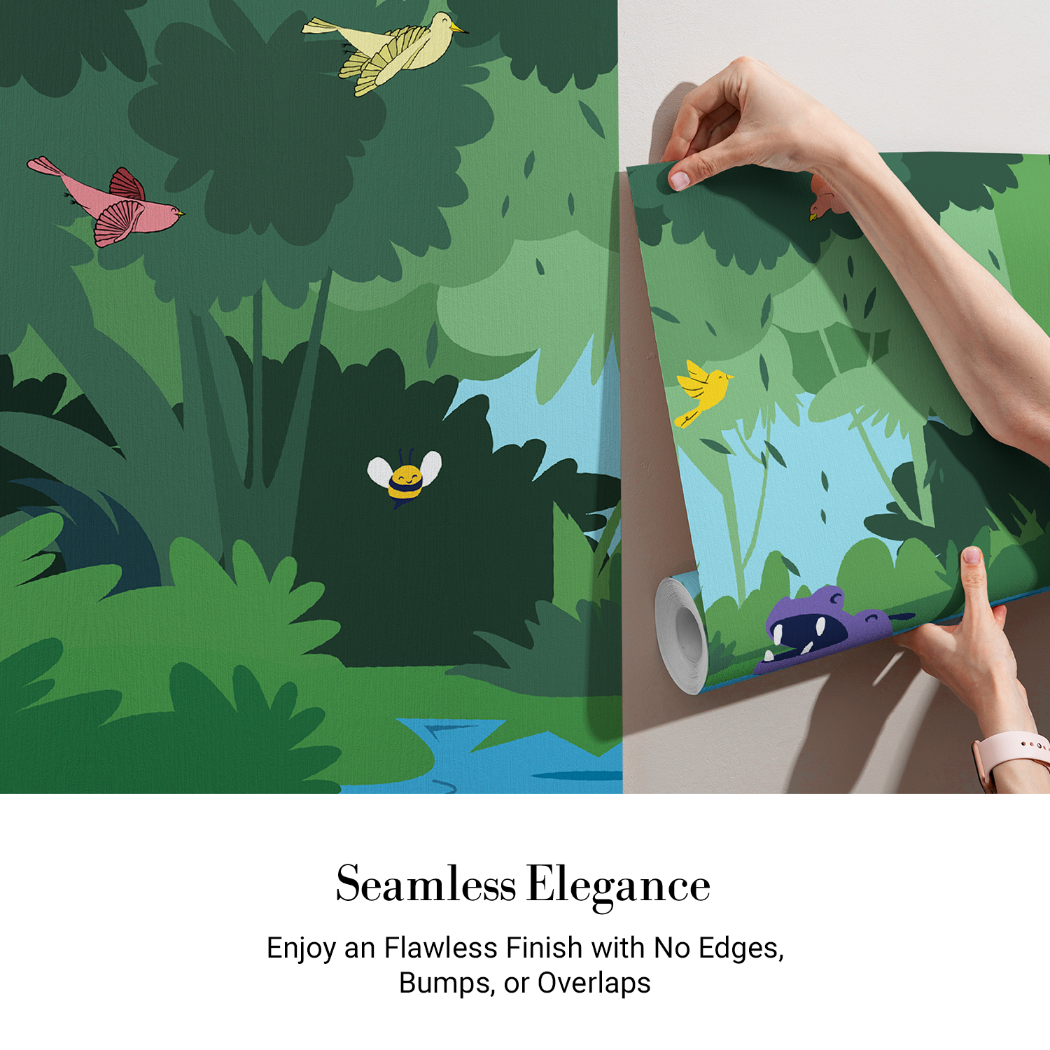 Transform your child's room into a lively jungle adventure with this playful wallpaper, showcasing adorable animals and lush greenery. Ideal for sparking creativity and adding a cheerful charm to bedrooms or play spaces. Let the vibrant wildlife theme create a delightful escape for your little ones to explore.