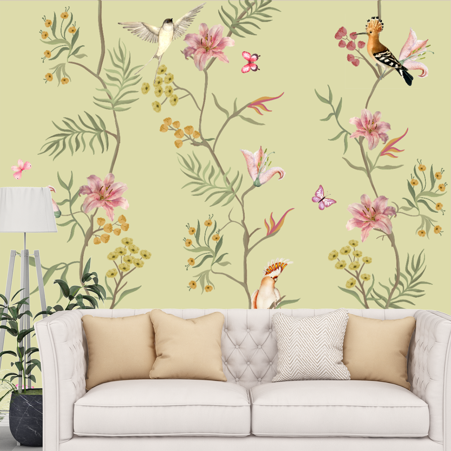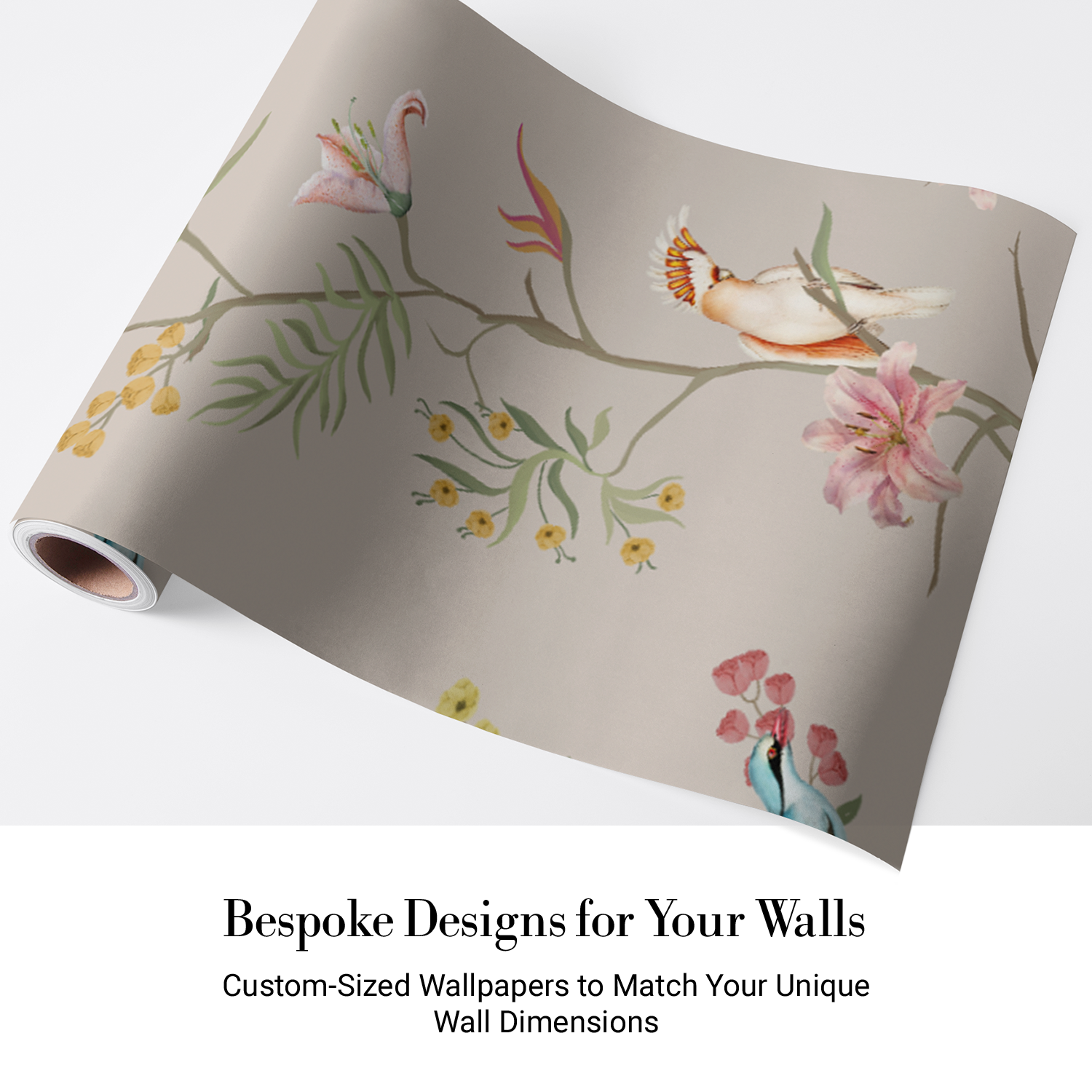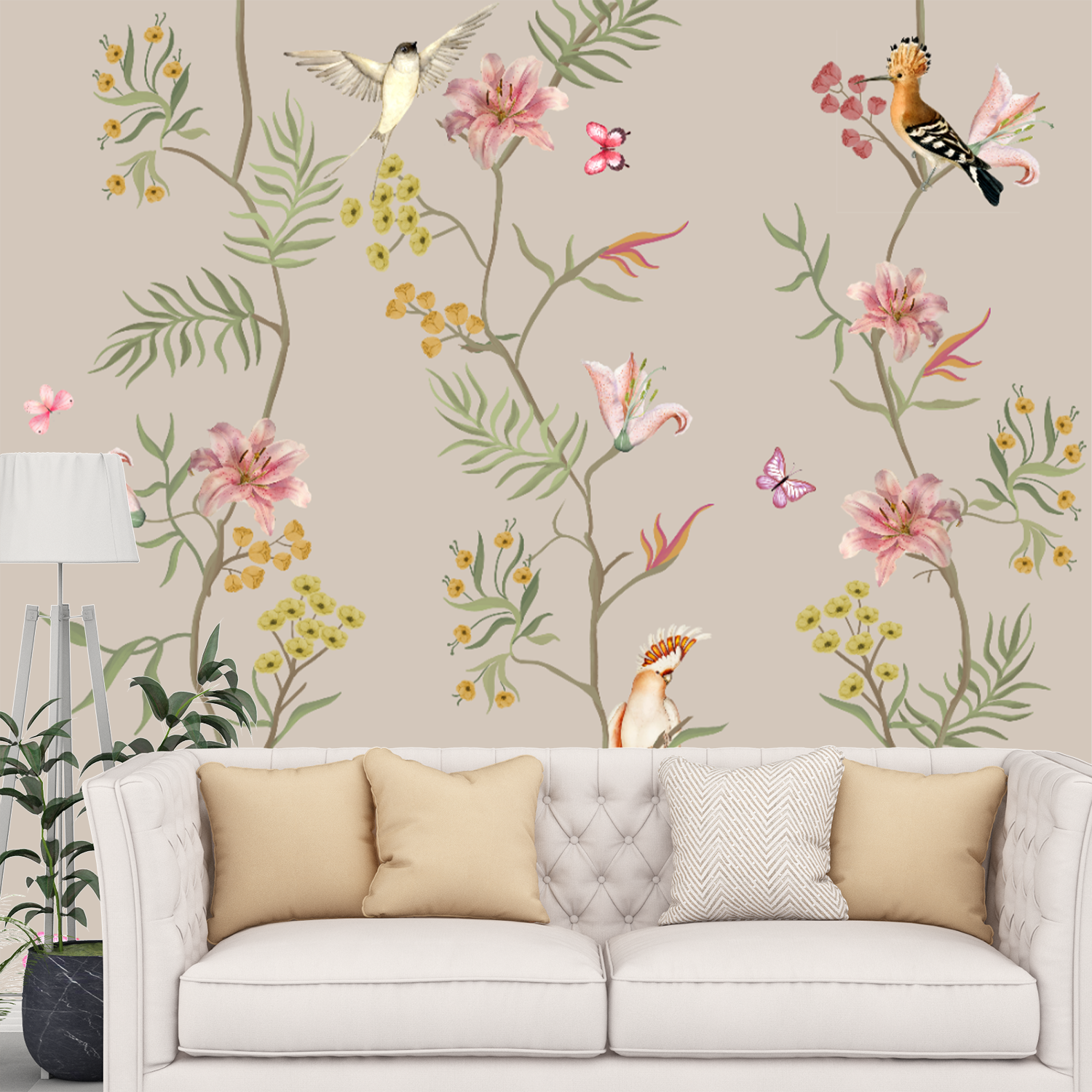 Delicate vines intertwined with vibrant flowers and graceful birds create a mesmerizing wallpaper design that brings a fresh and lively atmosphere to any space. Ideal for living rooms and creative spaces, this wallpaper adds an artistic touch with its elegant botanical elements.