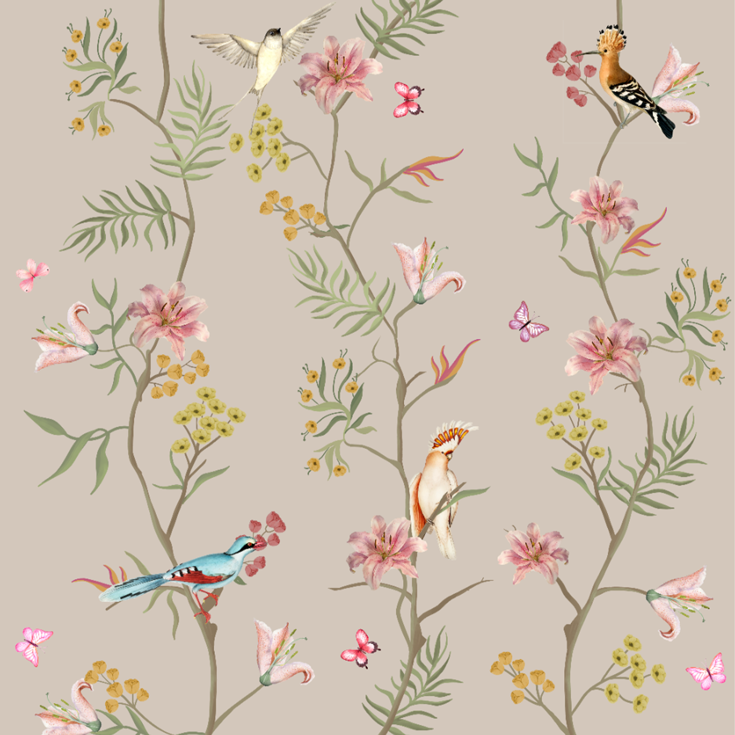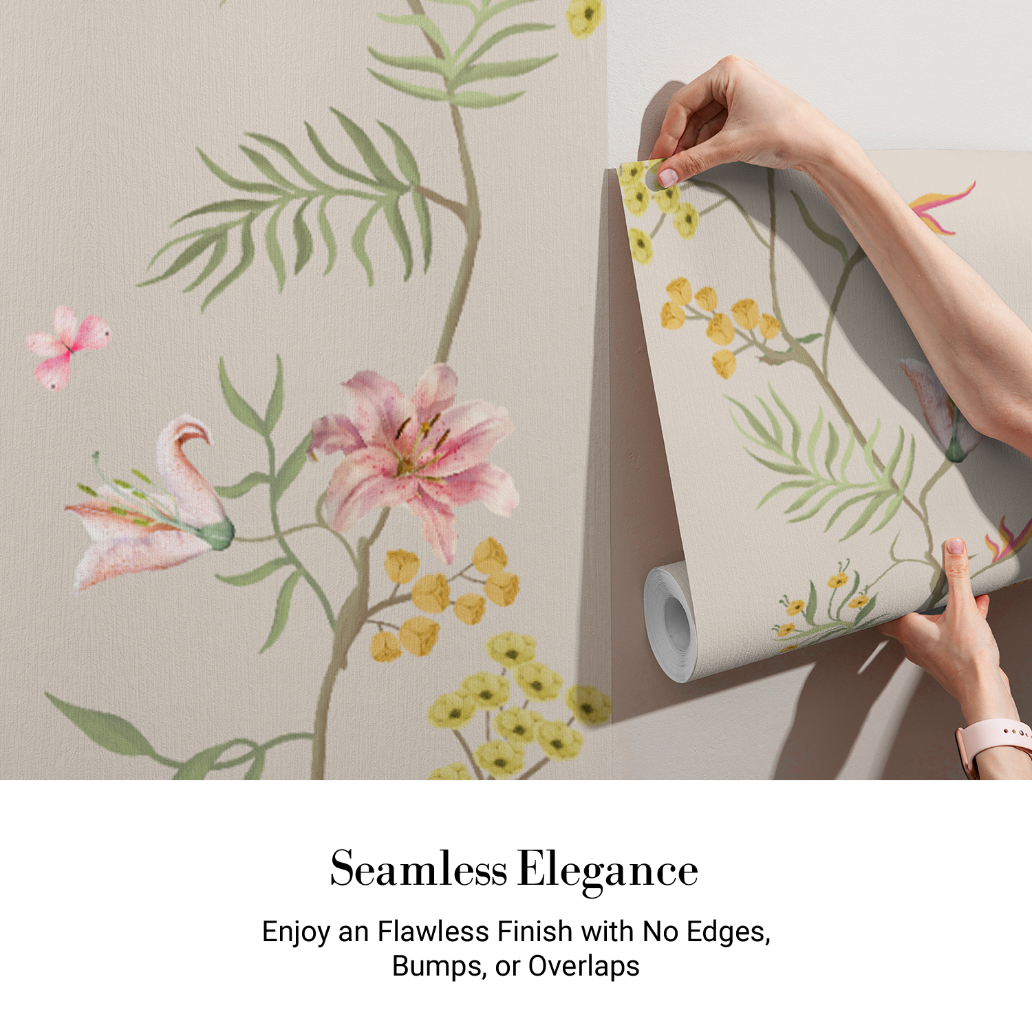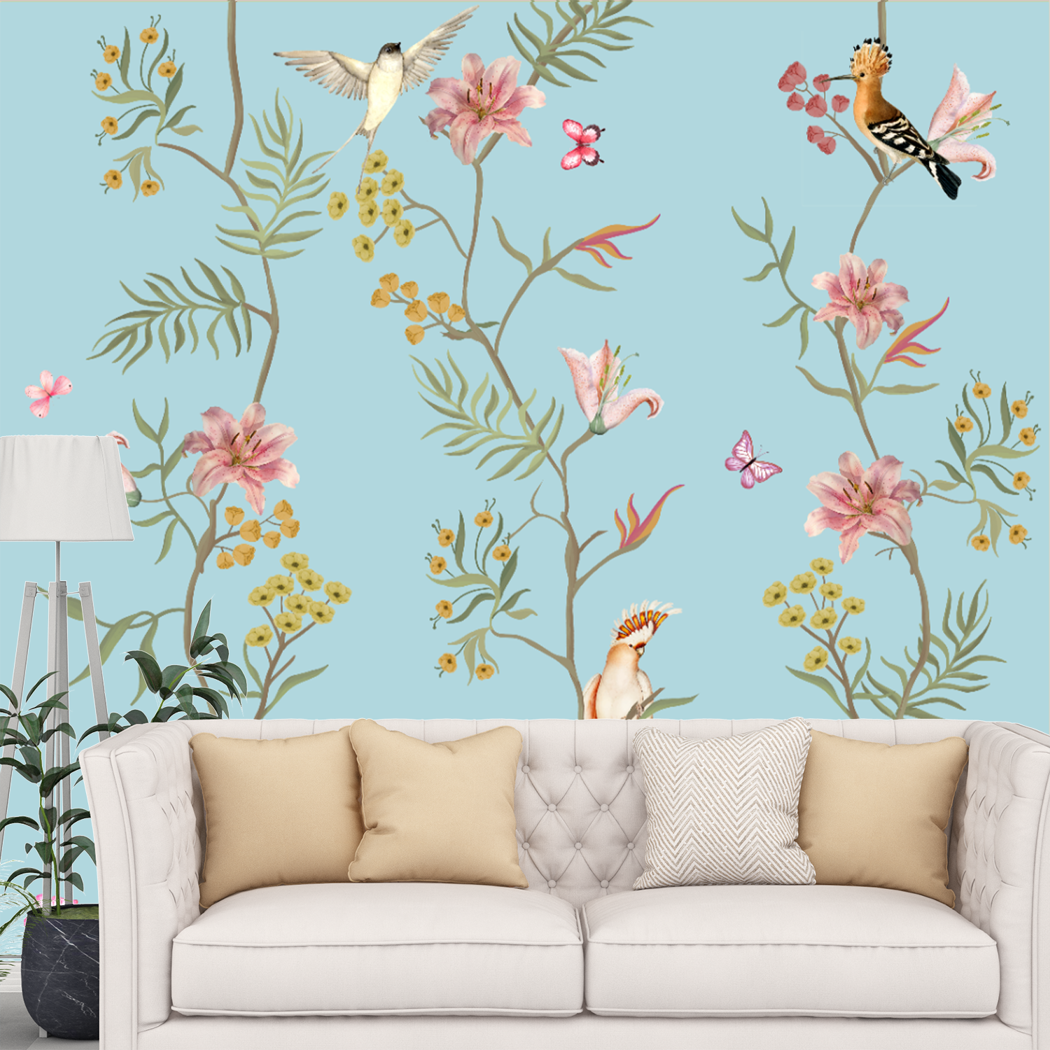 Delicate vines intertwined with vibrant flowers and graceful birds create a mesmerizing wallpaper design that brings a fresh and lively atmosphere to any space. Ideal for living rooms and creative spaces, this wallpaper adds an artistic touch with its elegant botanical elements.