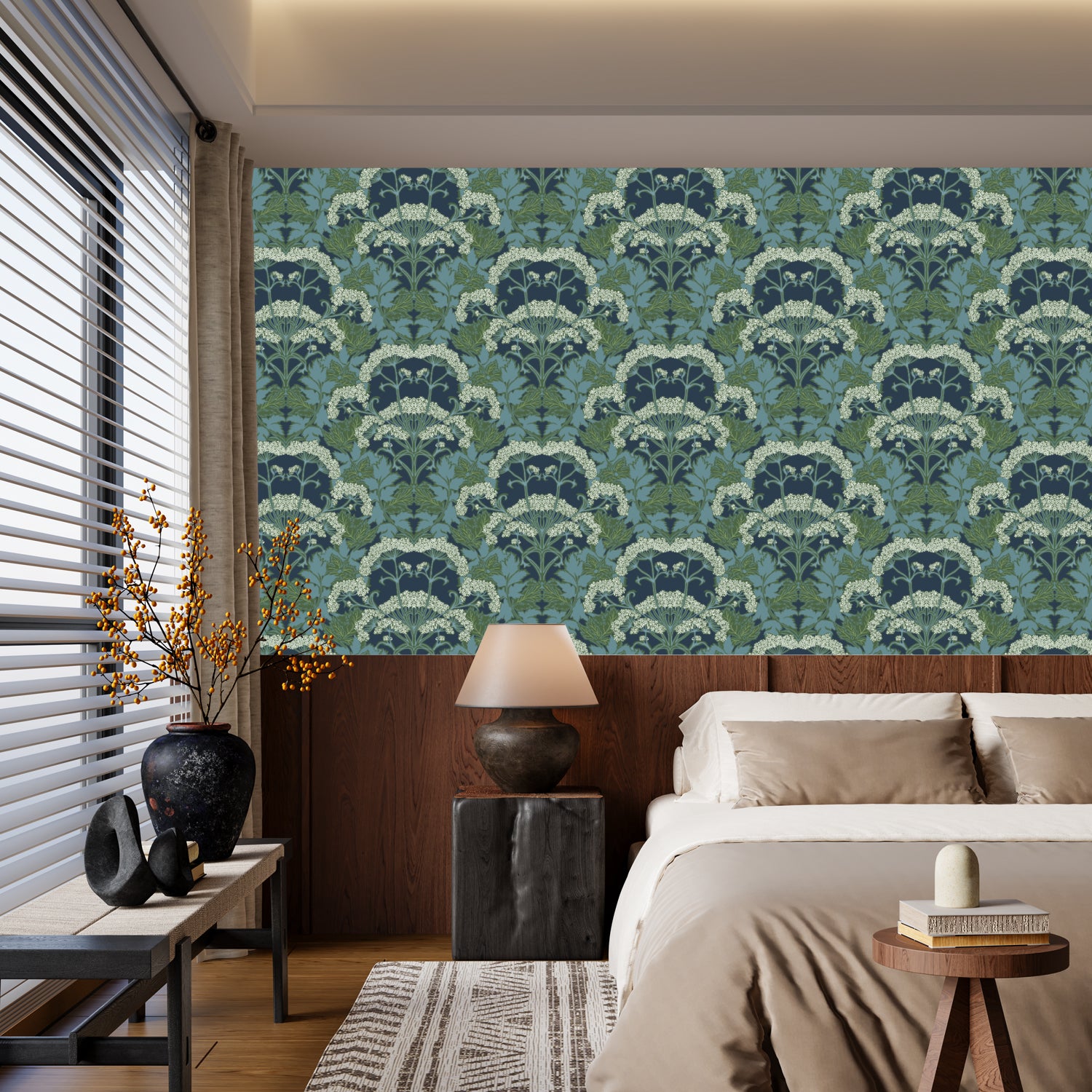 This refined damask wallpaper showcases an elaborate yet timeless pattern that adds a regal touch to any interior. The delicate interplay of motifs and colors creates a sophisticated ambiance, making it an ideal choice for luxurious home and commercial spaces.