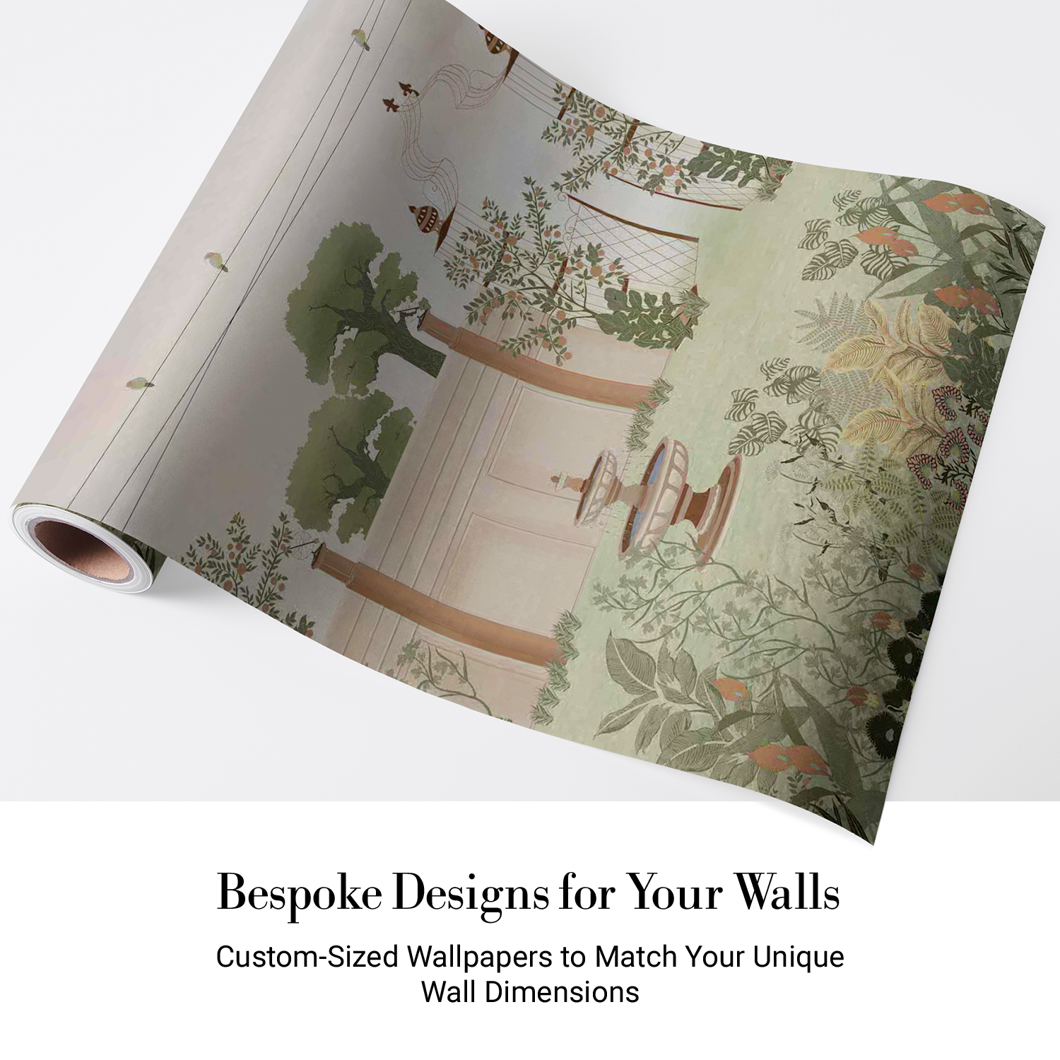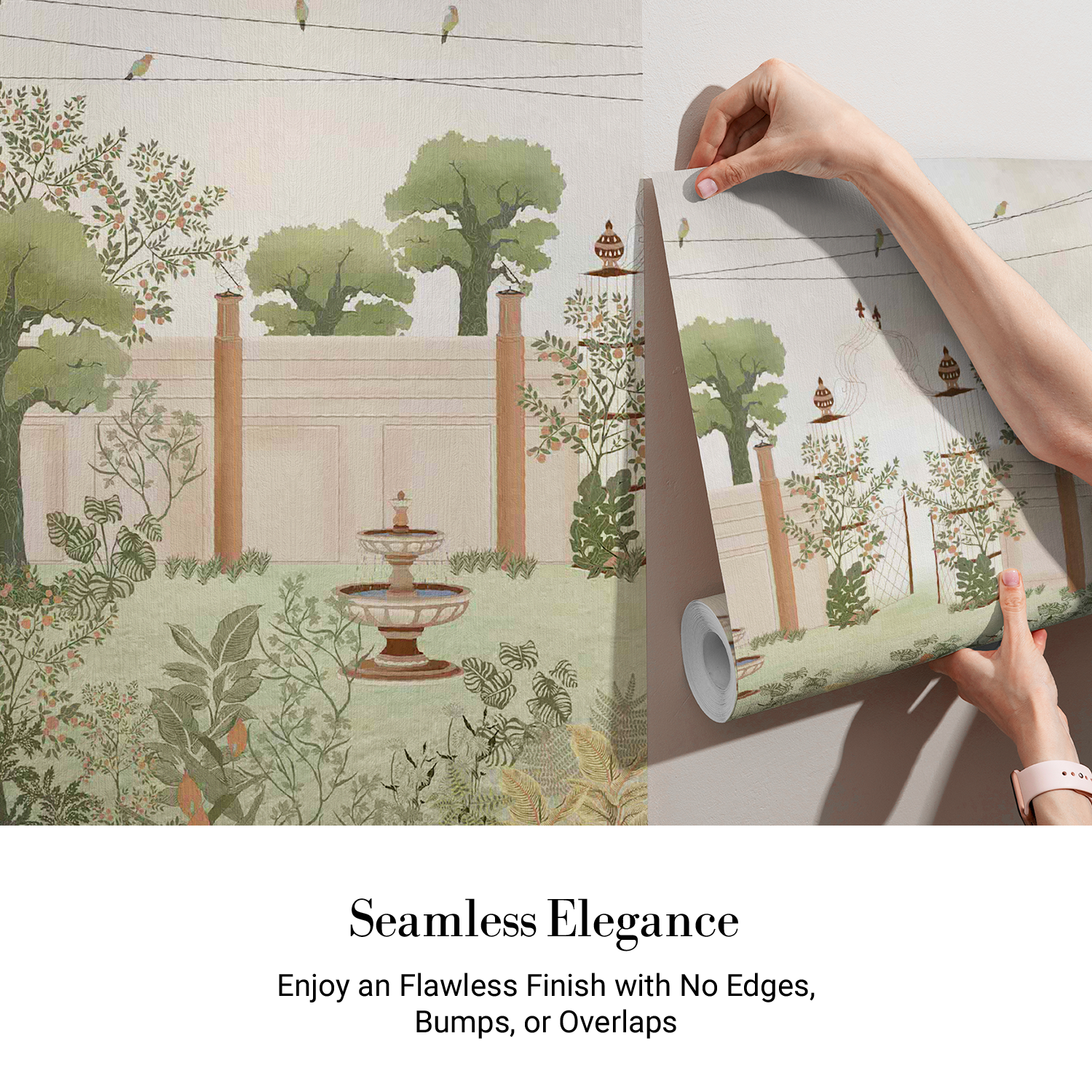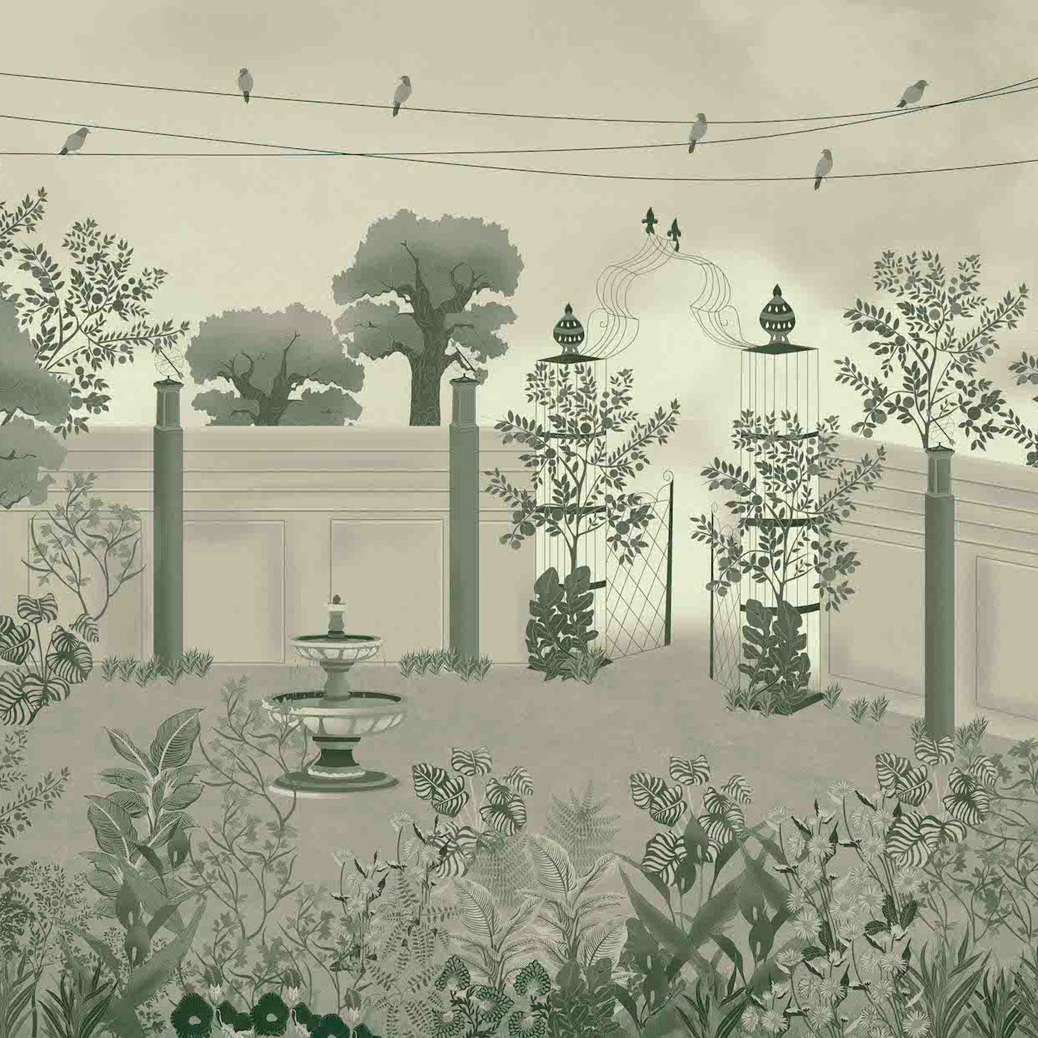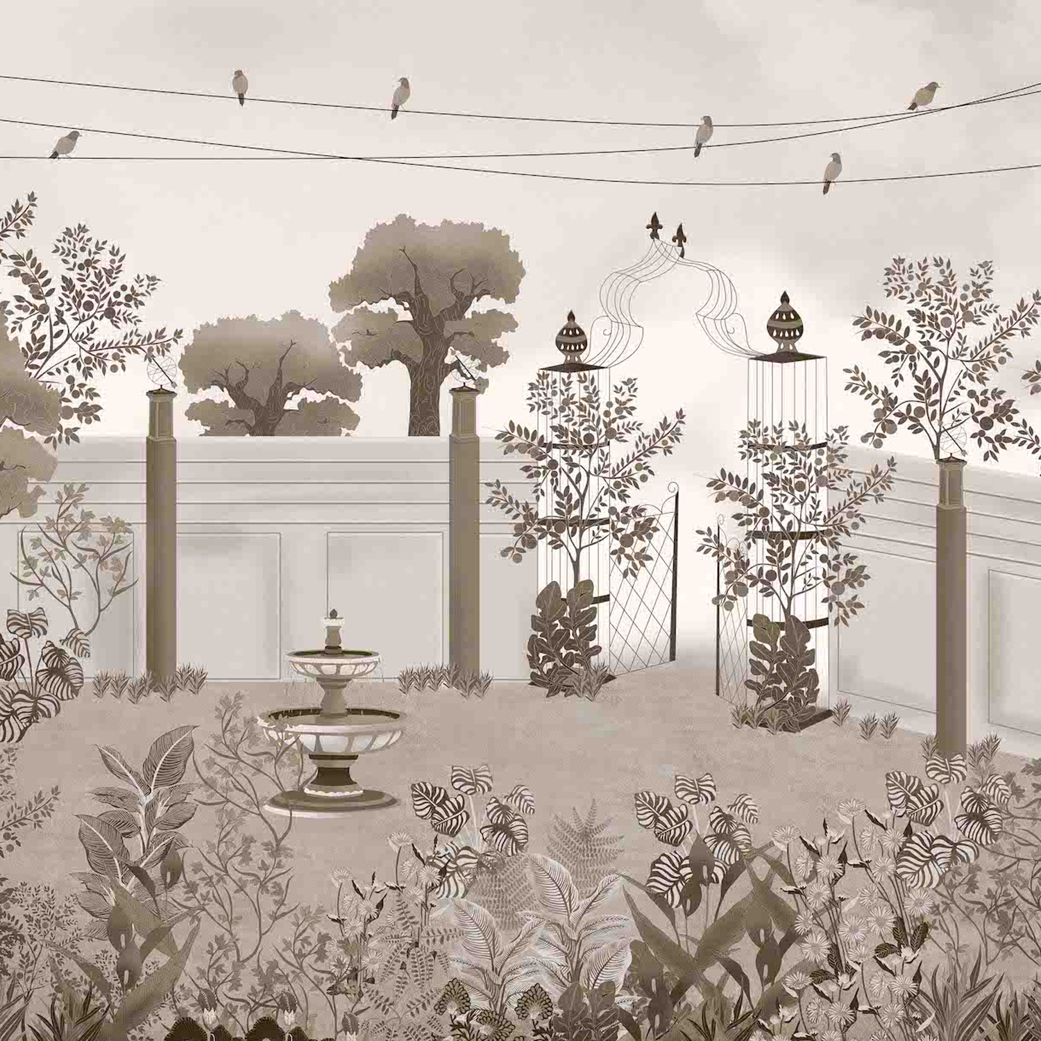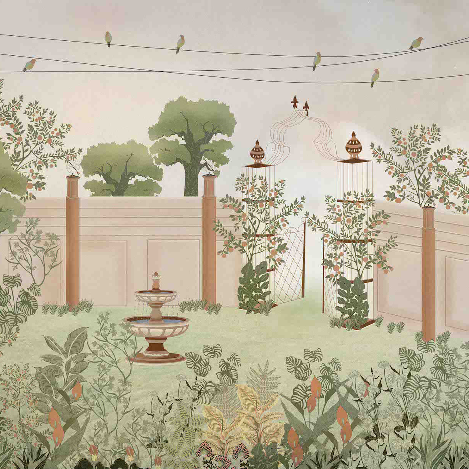 This wallpaper illustrates a peaceful garden enclosed by elegant walls and adorned with lush greenery, blooming plants, and trees. At its center, a charming fountain adds a tranquil touch, while decorative birdcages and birds perched on wires bring life to the scene. The soft, muted tones create a serene and sophisticated atmosphere, perfect for evoking a sense of calm and natural beauty. Ideal for spaces seeking a timeless, nature-inspired design.