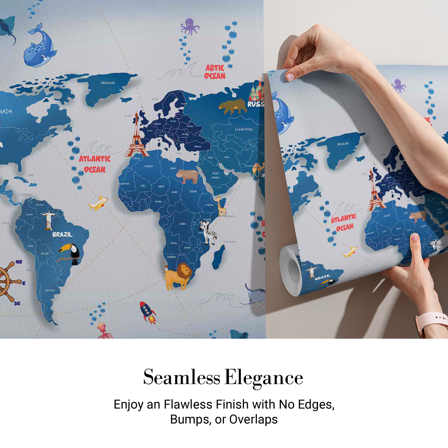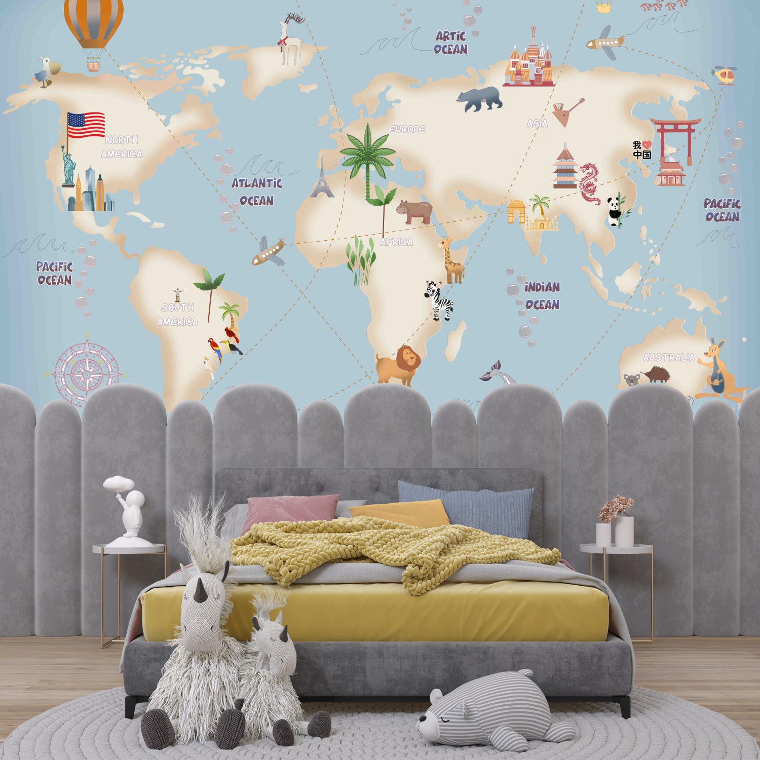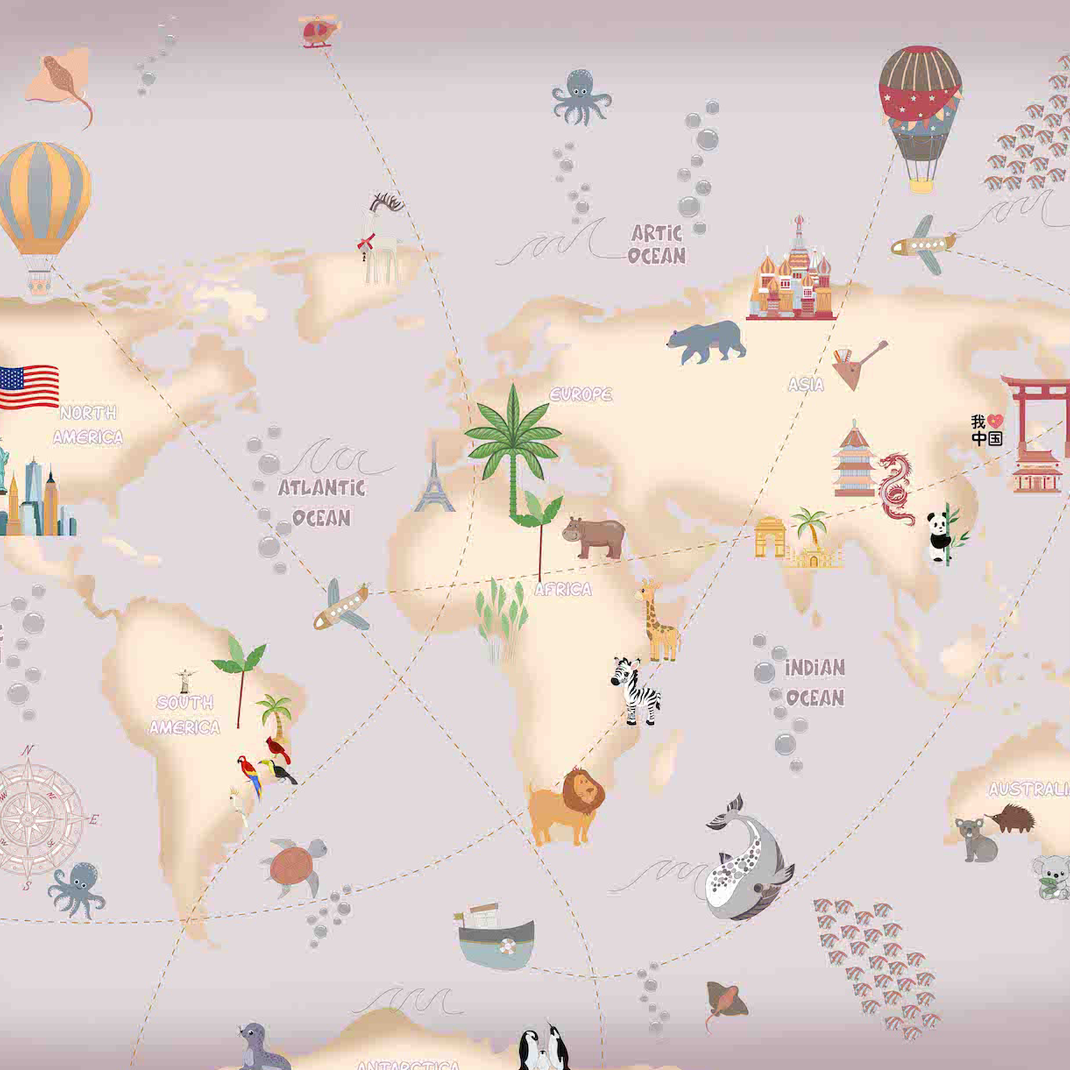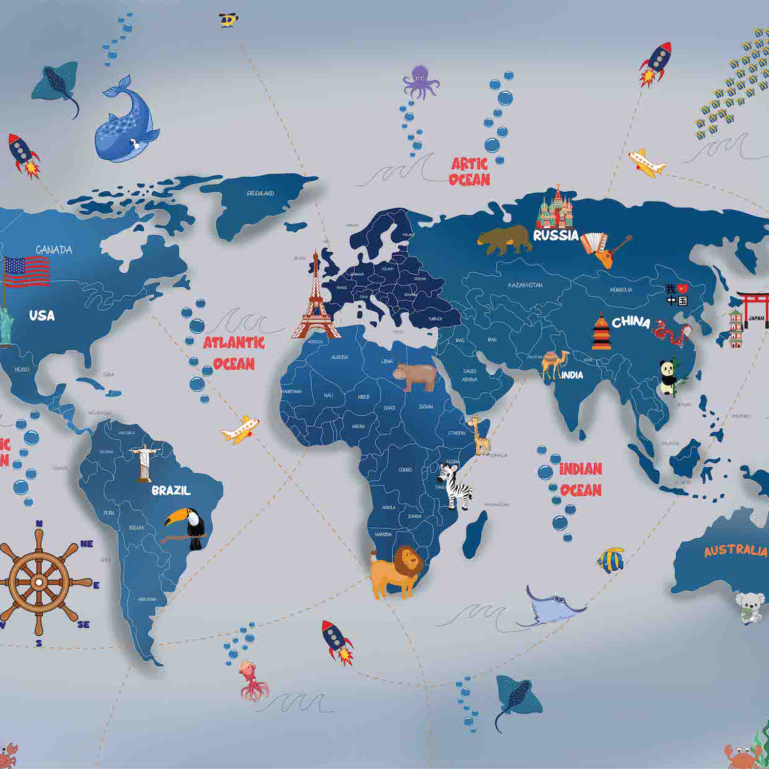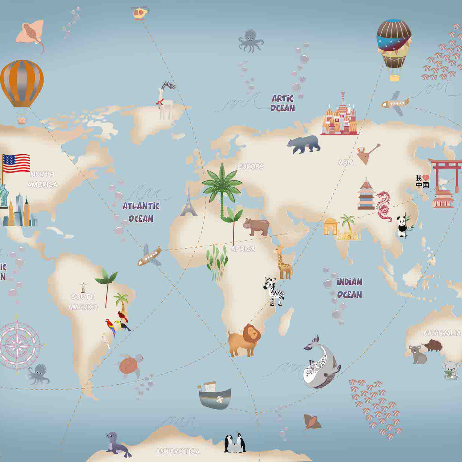 This wallpaper presents a playful world map adorned with illustrations of iconic landmarks, animals, and cultural elements from each continent. From penguins in Antarctica and pandas in Asia to lions in Africa and the Statue of Liberty in North America, it beautifully represents the diversity of the planet. Hot air balloons, ships, and marine life in the oceans add a whimsical touch. Perfect for children’s spaces, it’s educational and visually captivating.