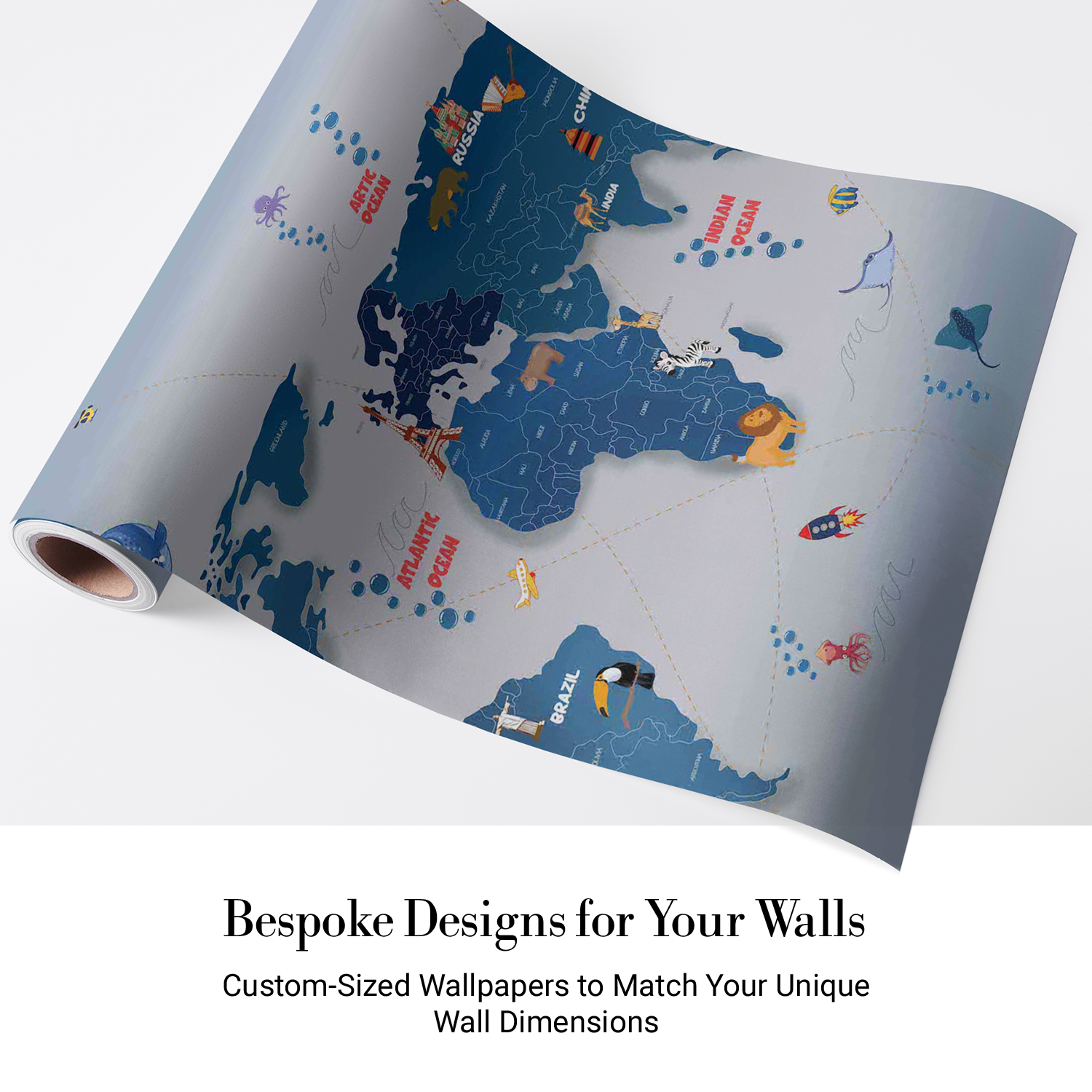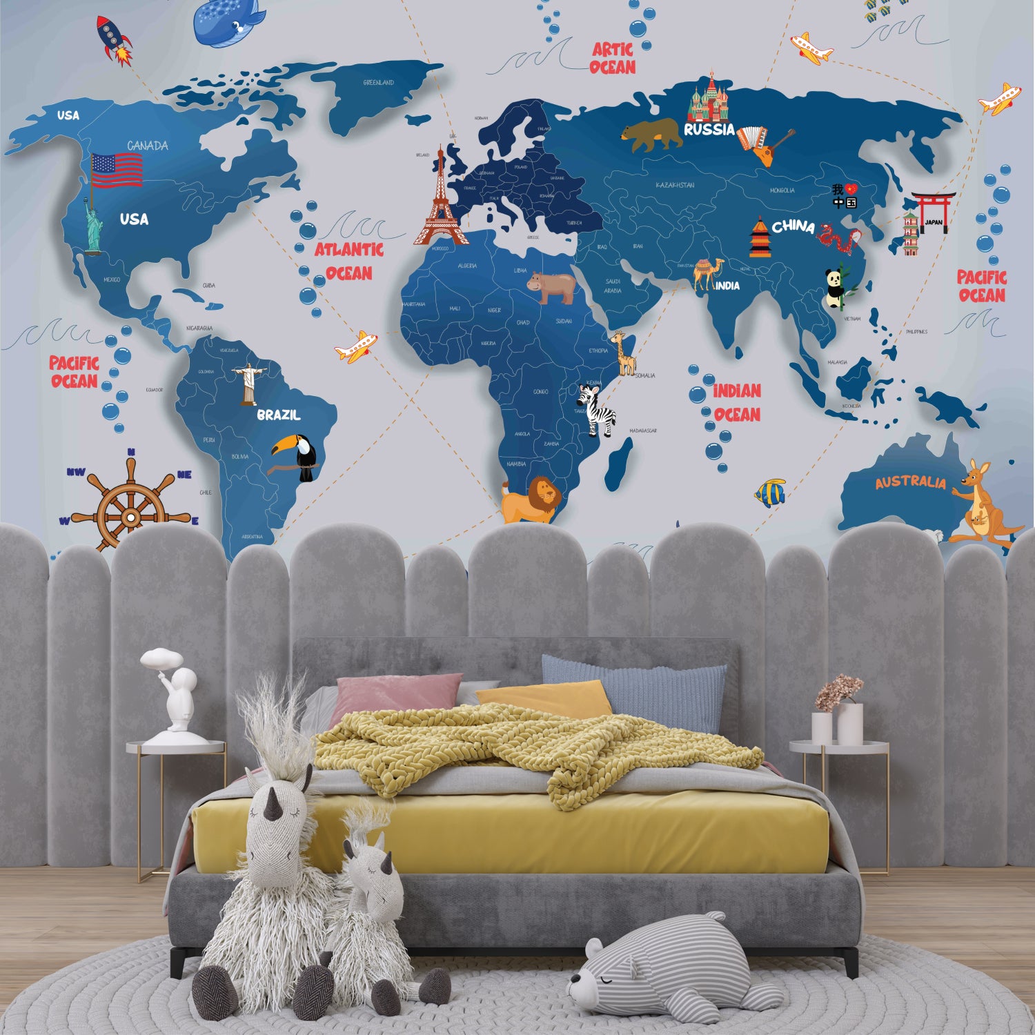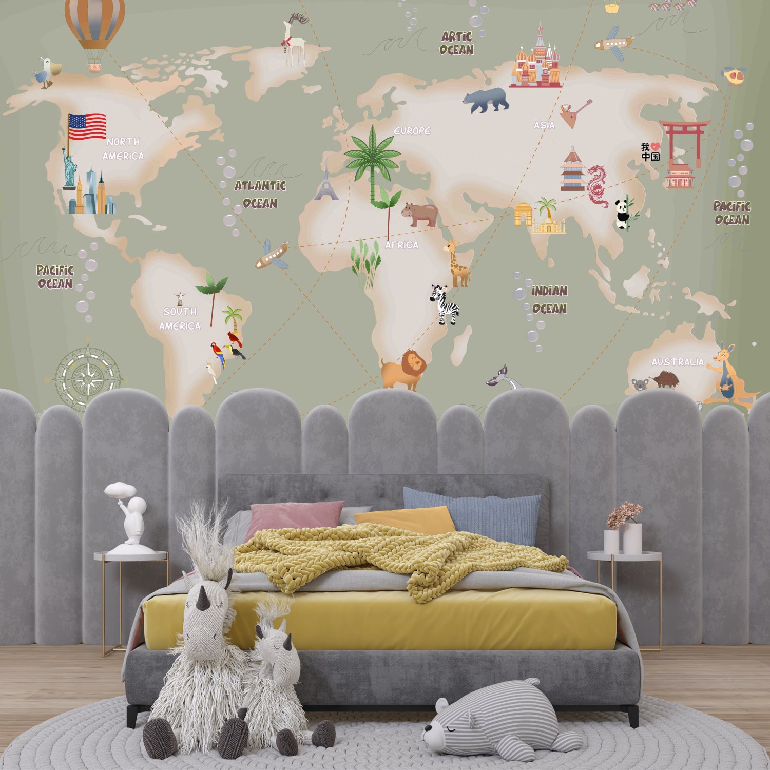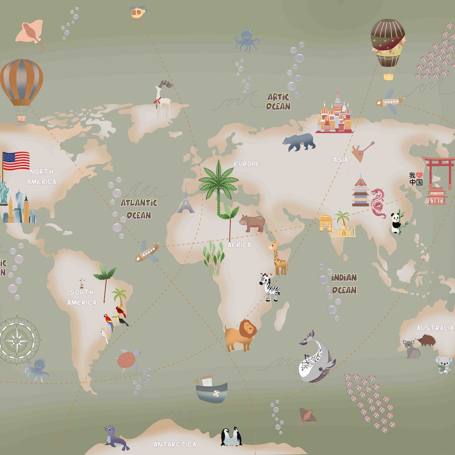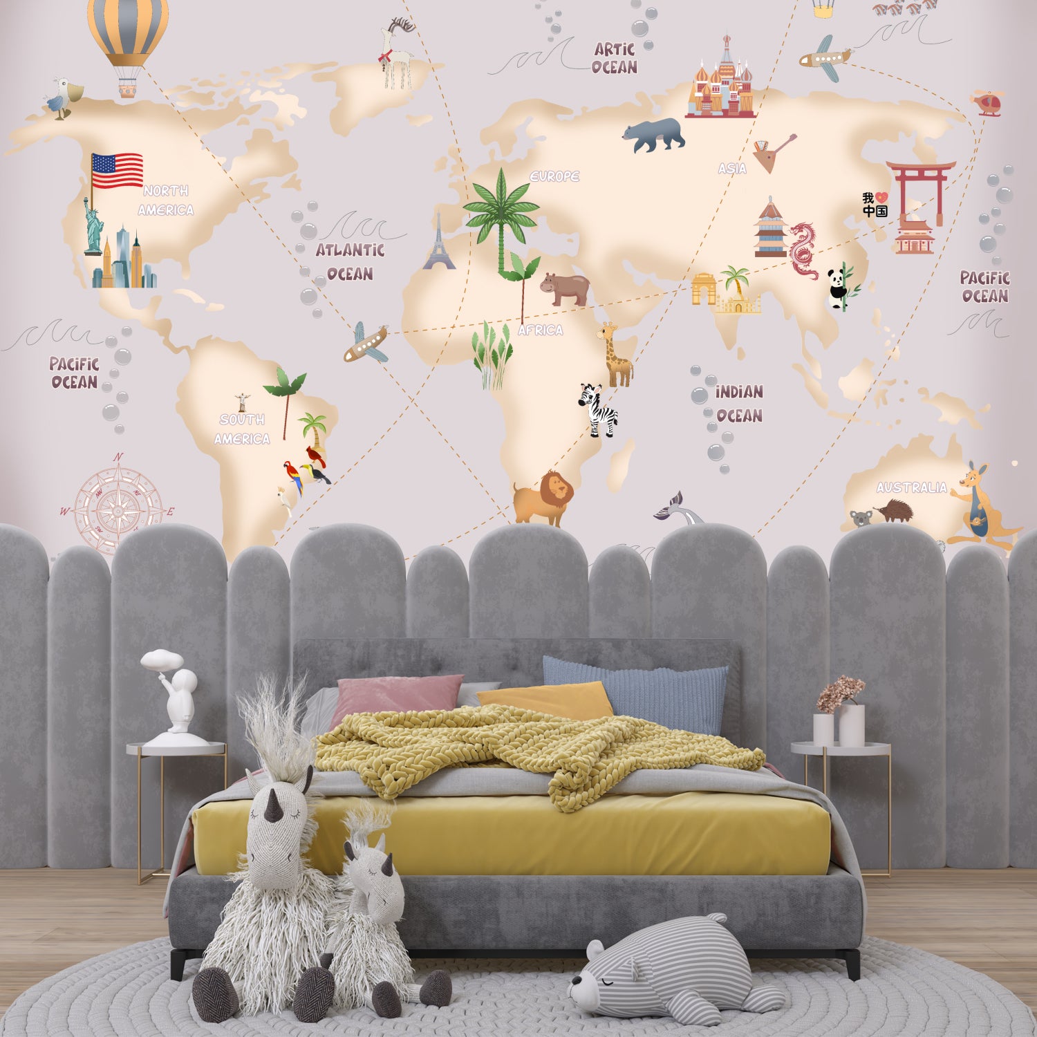 This wallpaper presents a playful world map adorned with illustrations of iconic landmarks, animals, and cultural elements from each continent. From penguins in Antarctica and pandas in Asia to lions in Africa and the Statue of Liberty in North America, it beautifully represents the diversity of the planet. Hot air balloons, ships, and marine life in the oceans add a whimsical touch. Perfect for children’s spaces, it’s educational and visually captivating.
