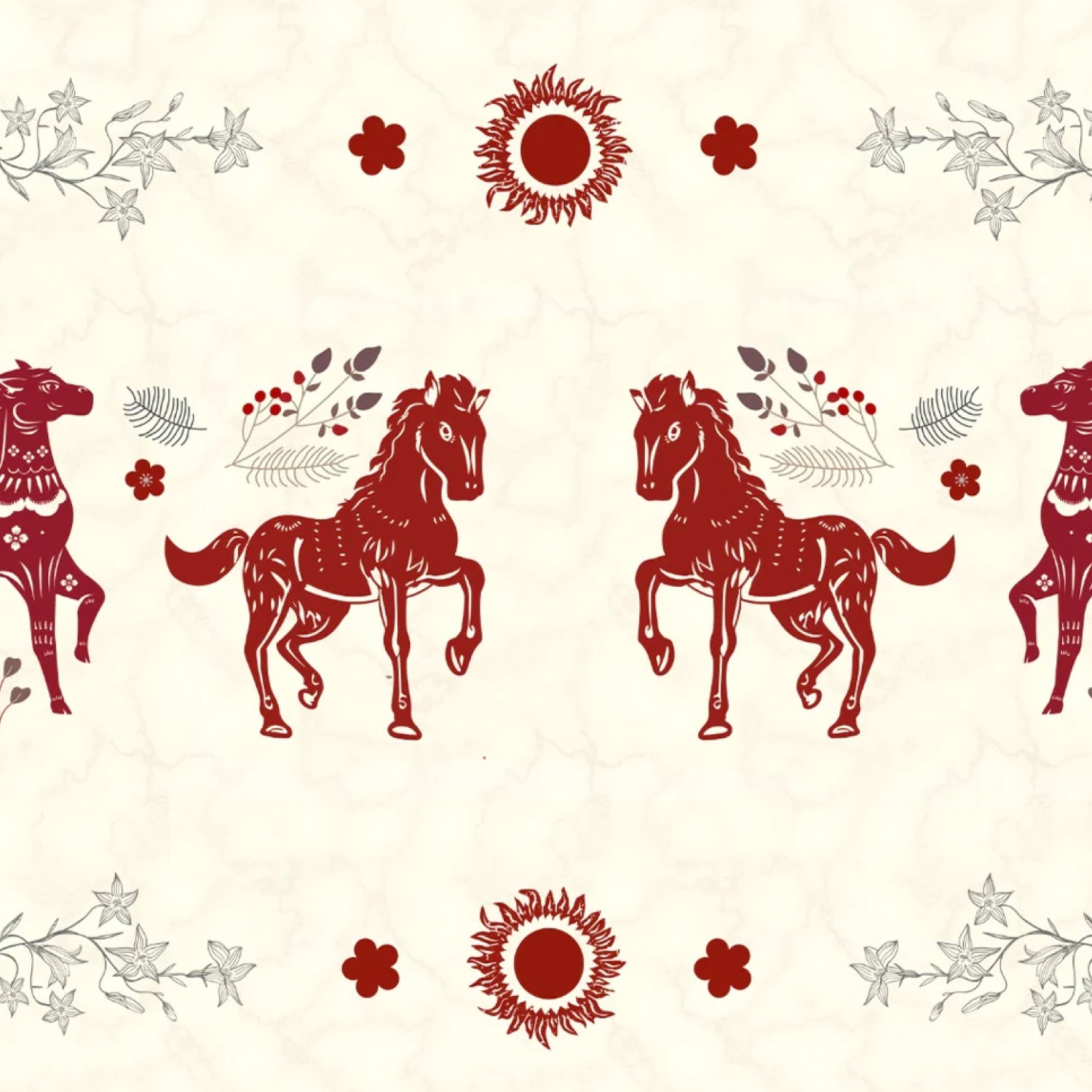 Infuse a sense of heritage and charm into your space with this Stallions of Grace themed wallpaper. Featuring beautifully stylized horses, floral accents, and sun motifs, this design brings a traditional folk-art aesthetic to life. Perfect for creating a warm, inviting atmosphere, this wallpaper is ideal for living rooms, hallways, or any space needing a touch of timeless elegance and cultural richness.