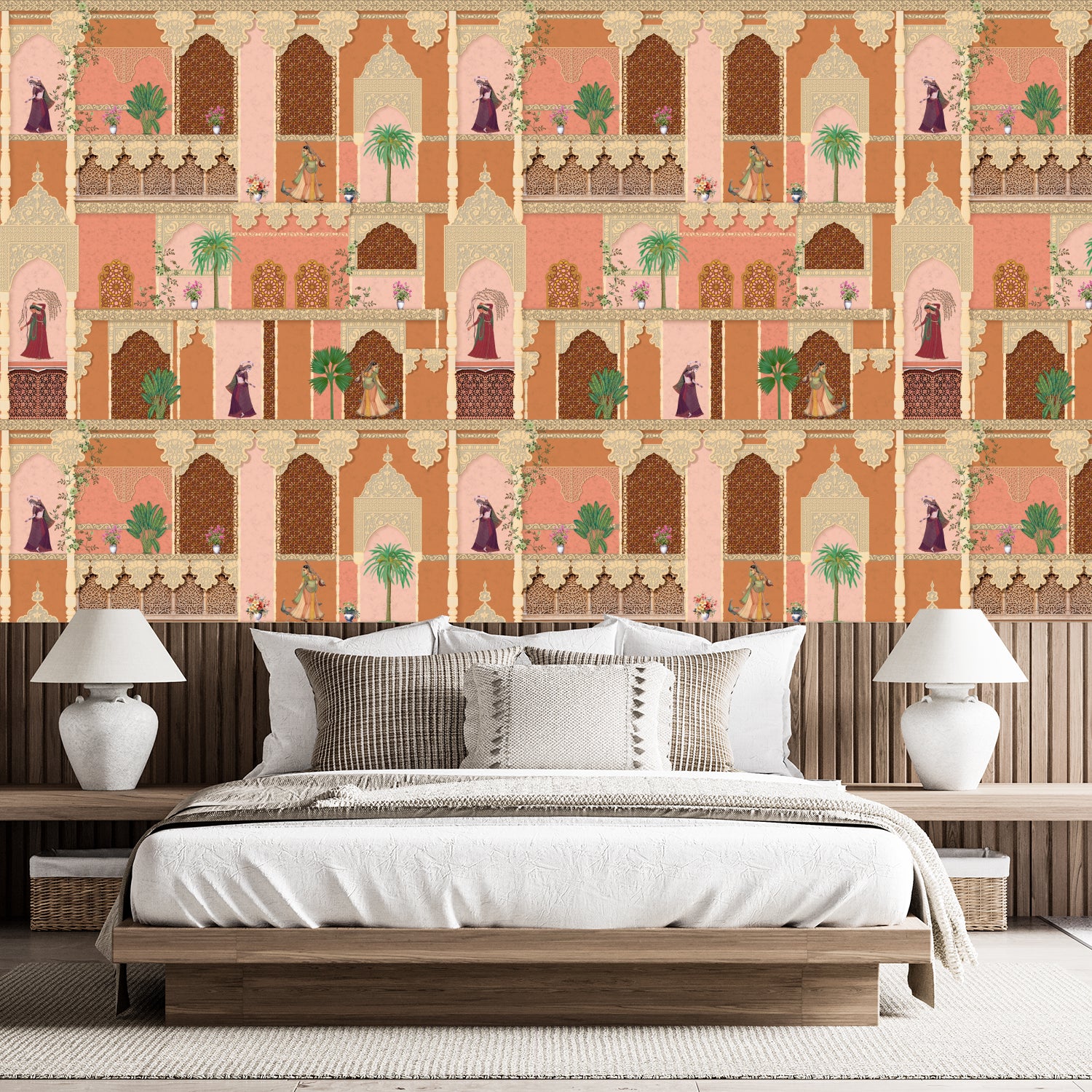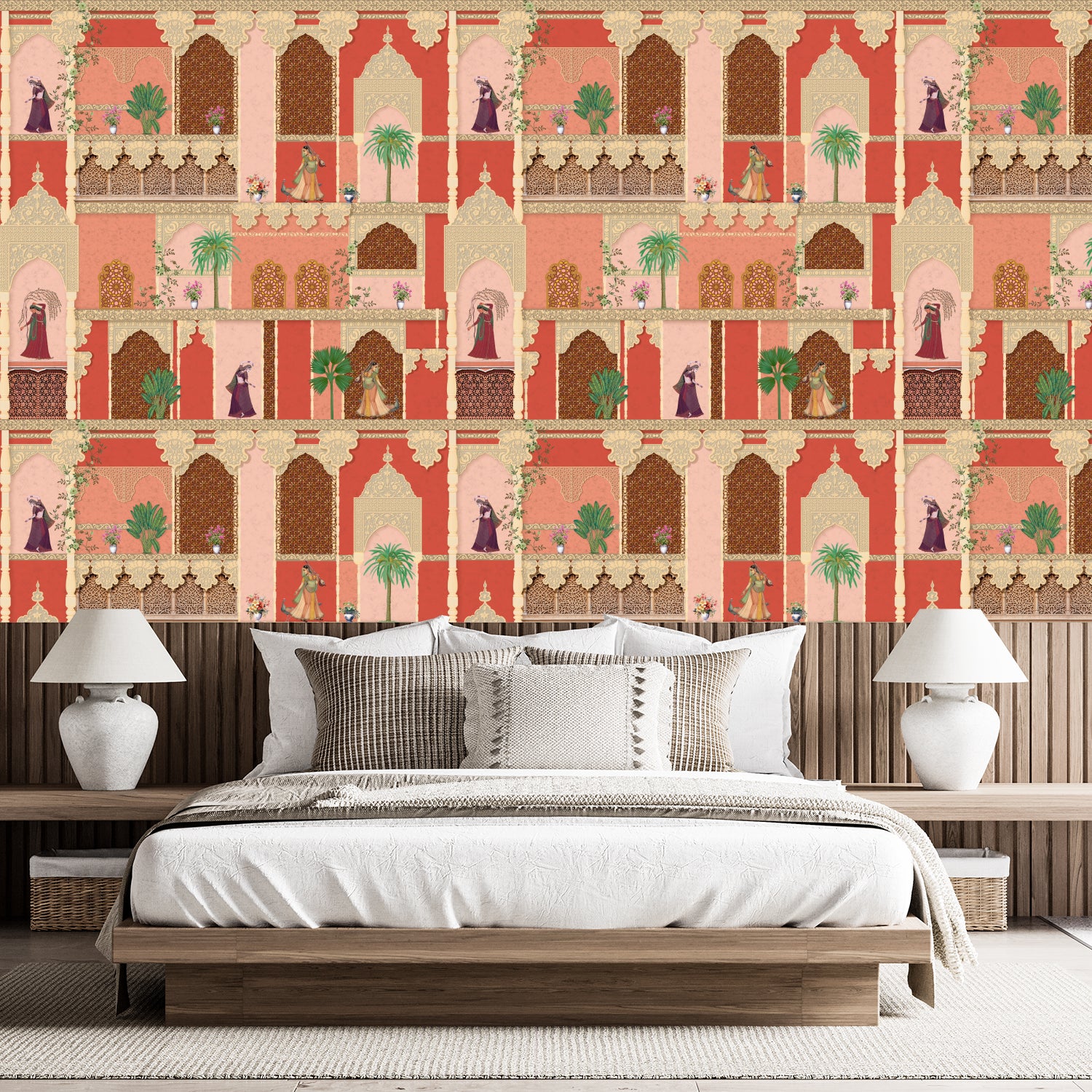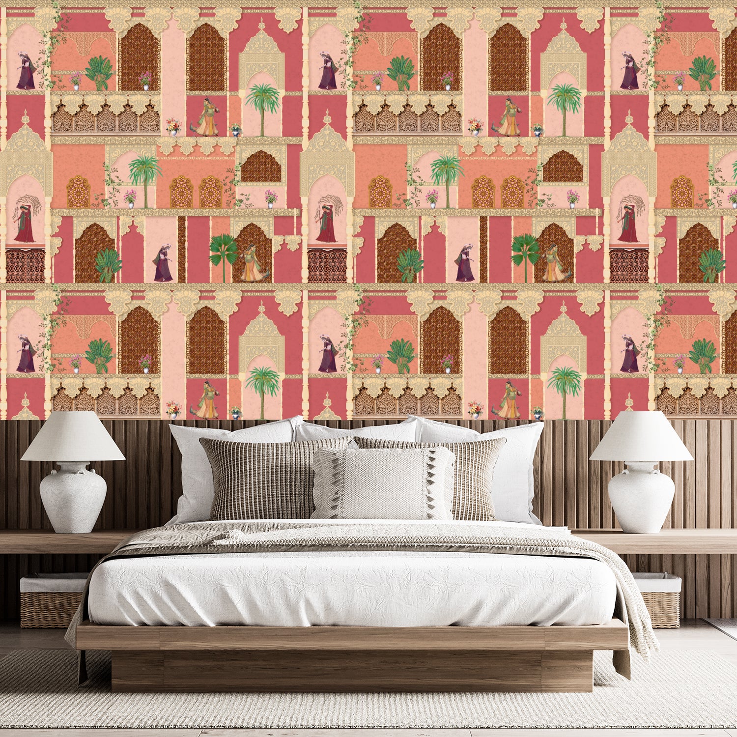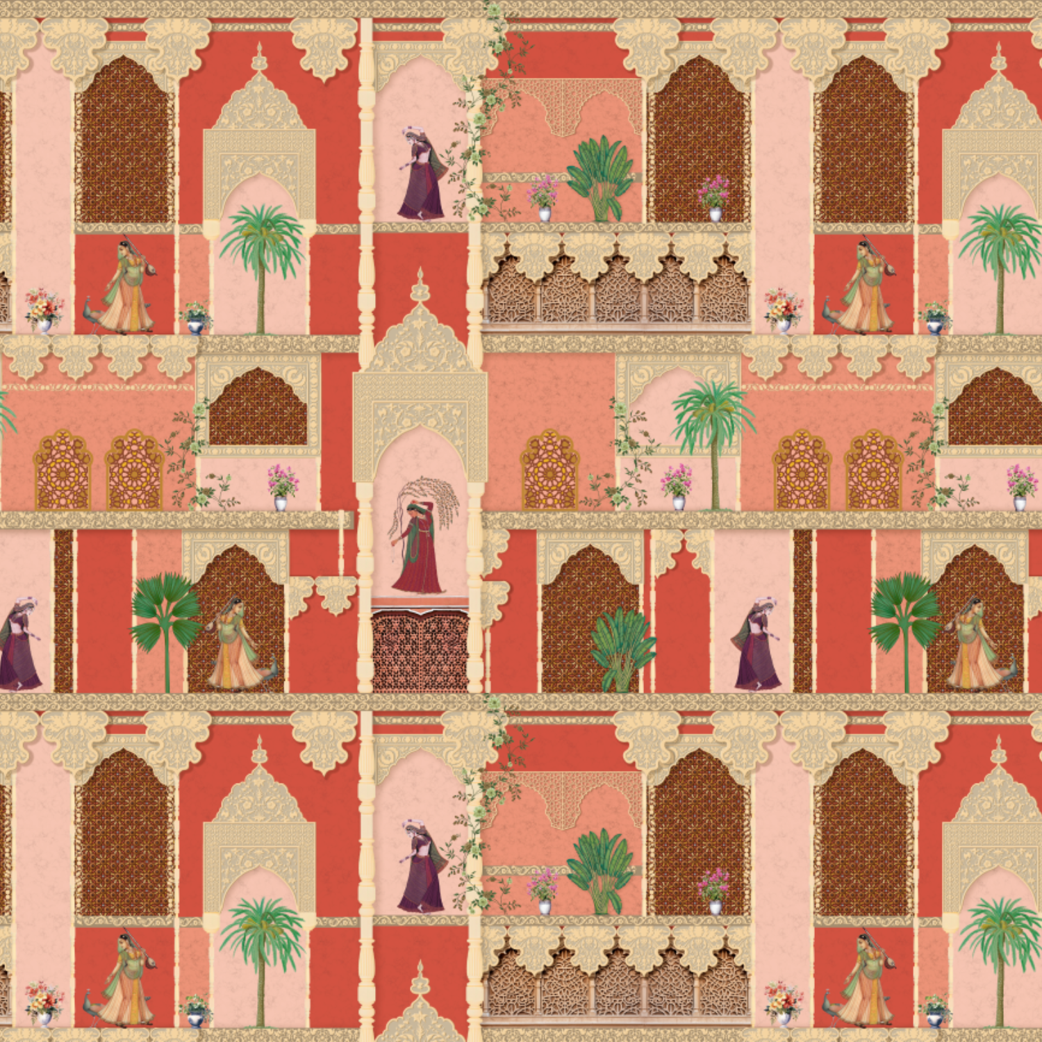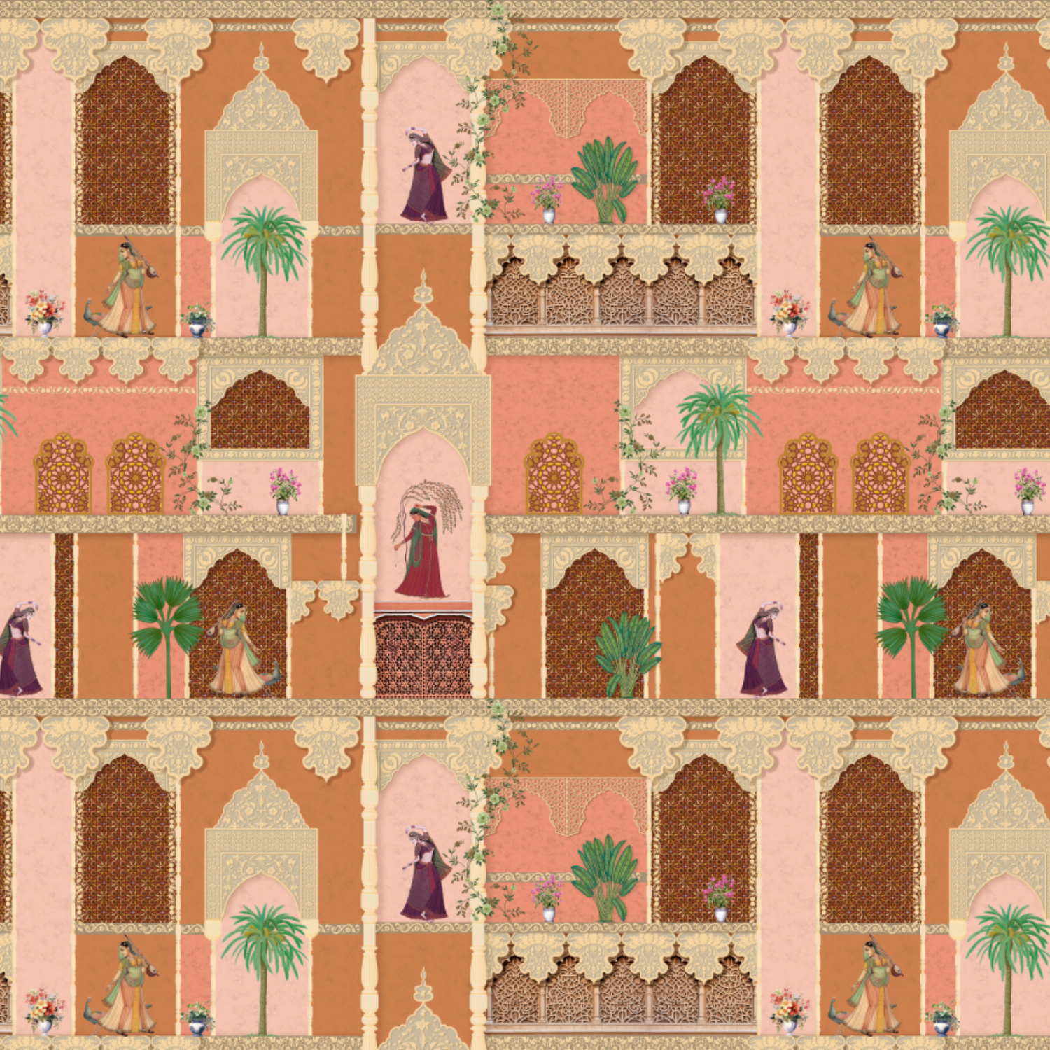 Transform your space with this exquisite wall mural inspired by Mughal architecture, featuring intricate arches, ornate balconies, and traditional Indian motifs. The design creates the illusion of a royal courtyard, complete with detailed latticework and vibrant scenes of regal figures and lush greenery. This mural adds a touch of heritage and sophistication, bringing the charm of historic palaces to your interiors.