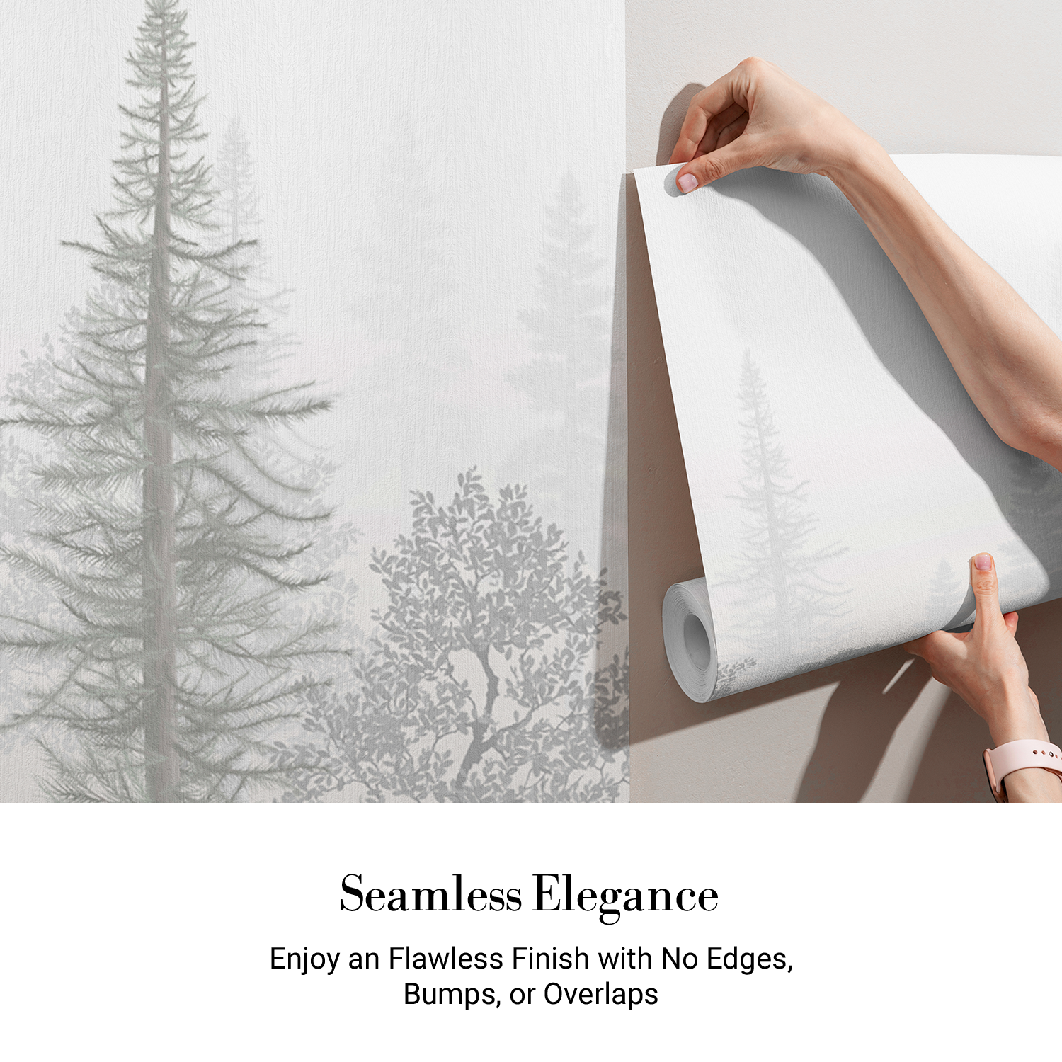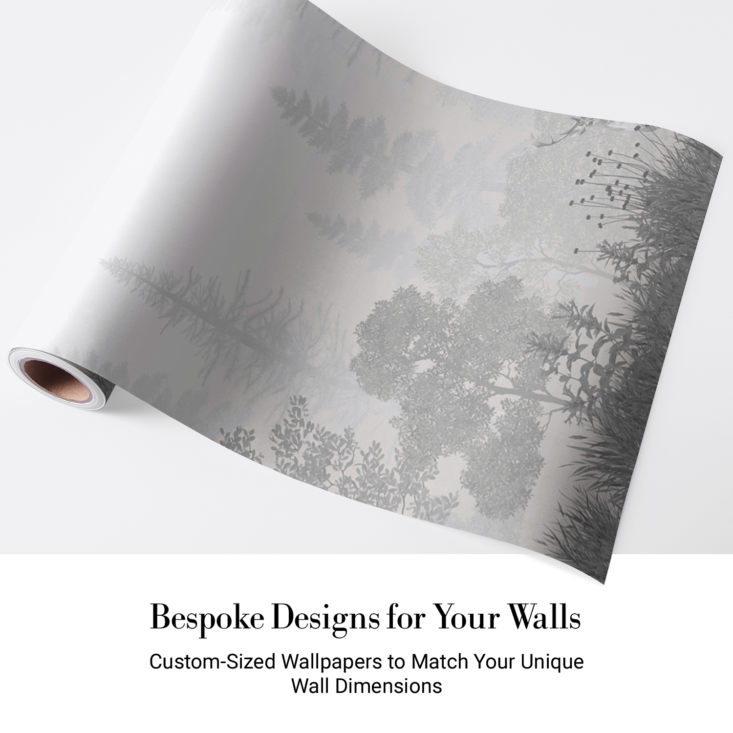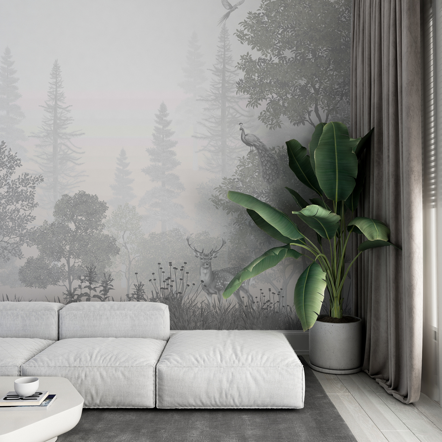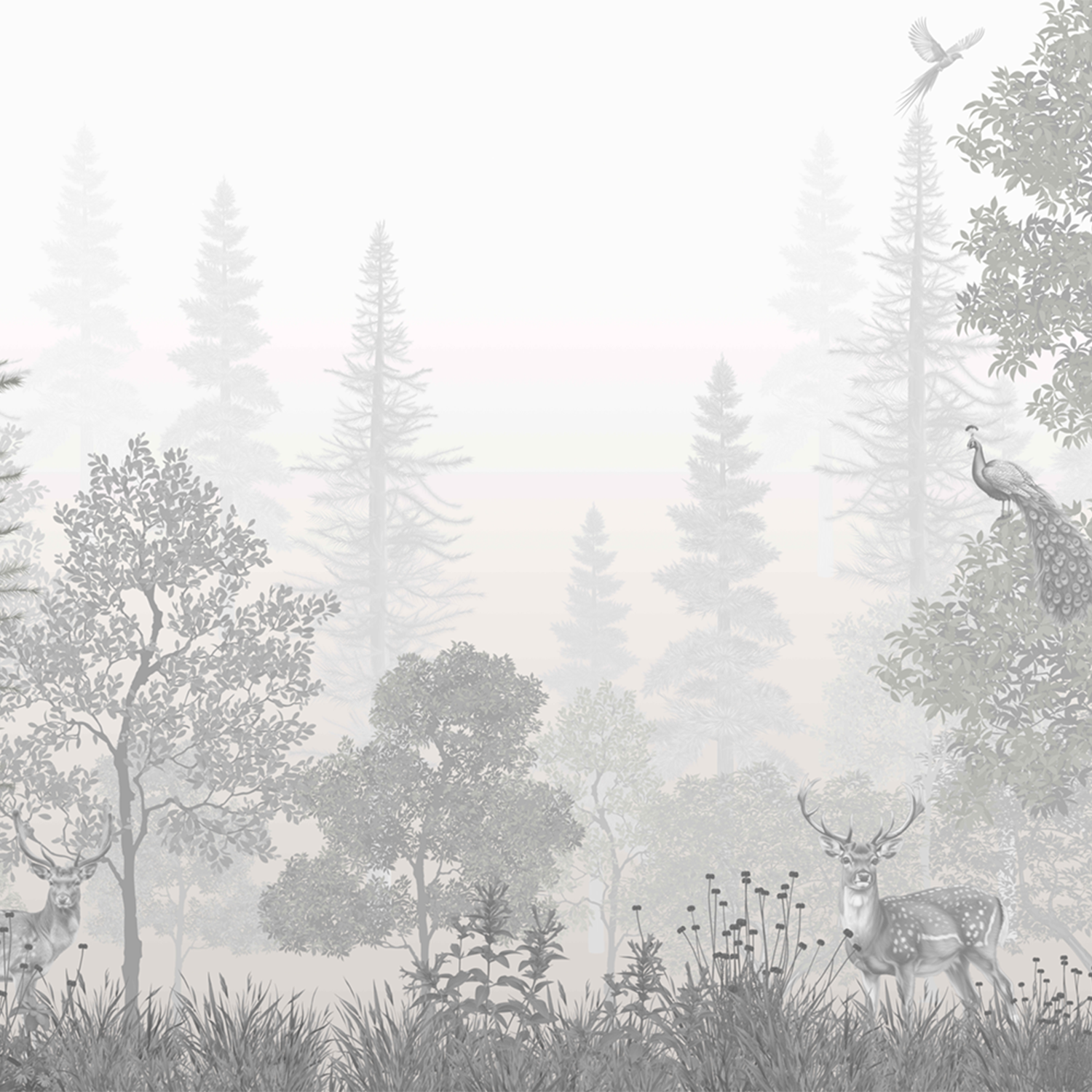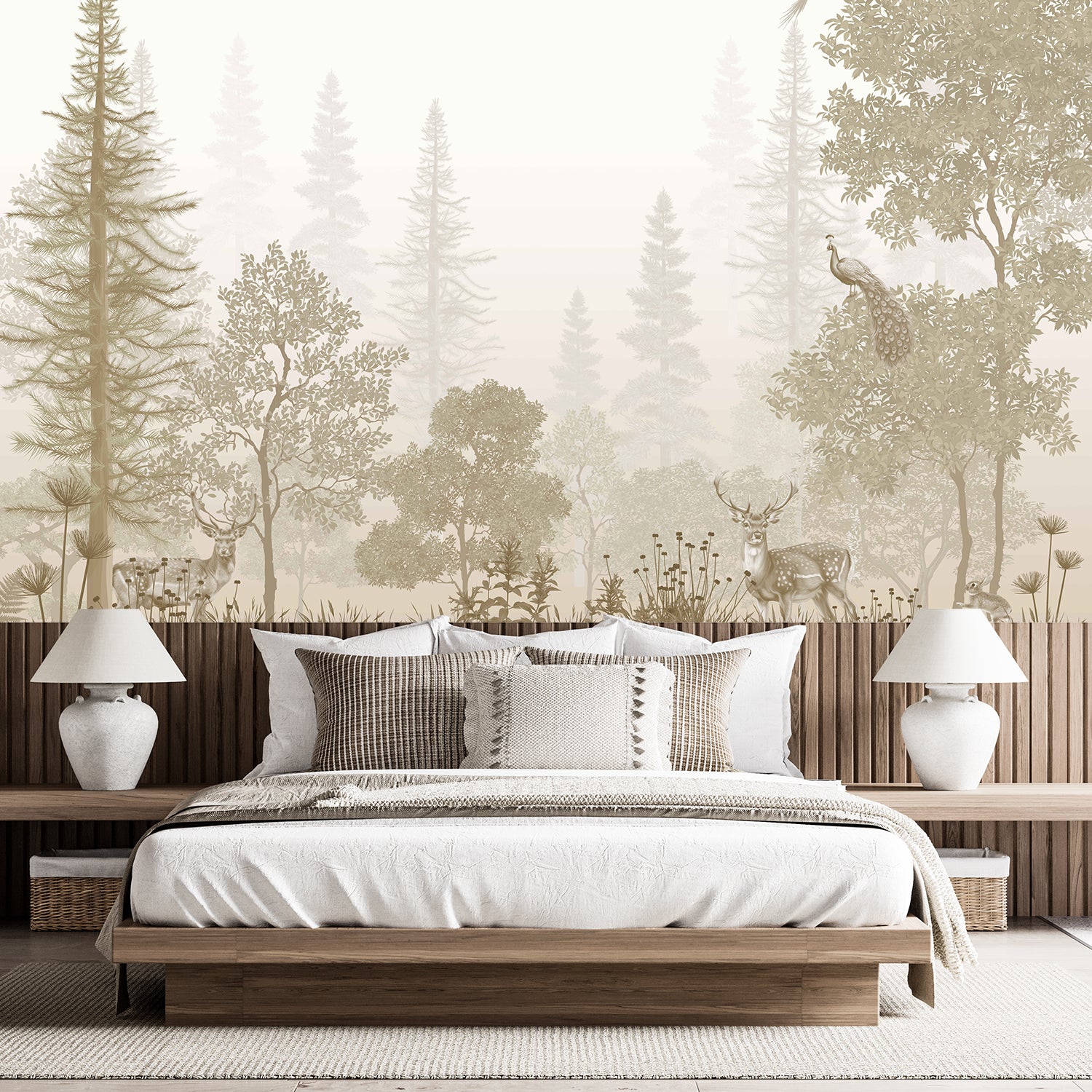 Immerse yourself in the soothing hues of a misty forest with this tranquil wallpaper. Gentle tones of earthy browns and soft greens depict a peaceful woodland scene, complete with elegant deer and a majestic peacock. This nature-inspired design is perfect for creating a calming and meditative retreat in your home.