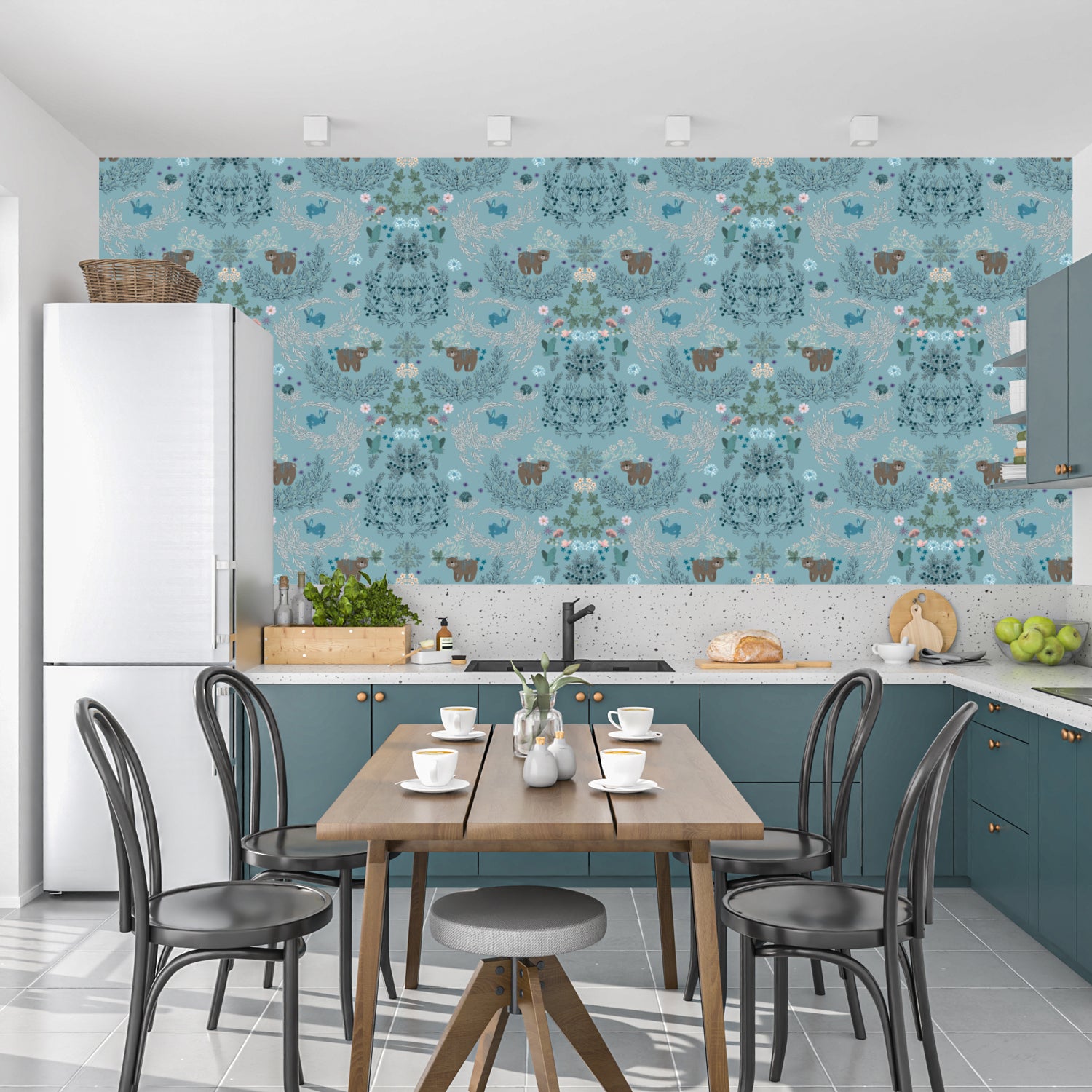 A serene underwater-inspired wallpaper featuring delicate marine life and coral formations. Its soothing blue hues create a refreshing coastal ambiance, perfect for bathrooms, kitchens, and seaside-themed interiors.