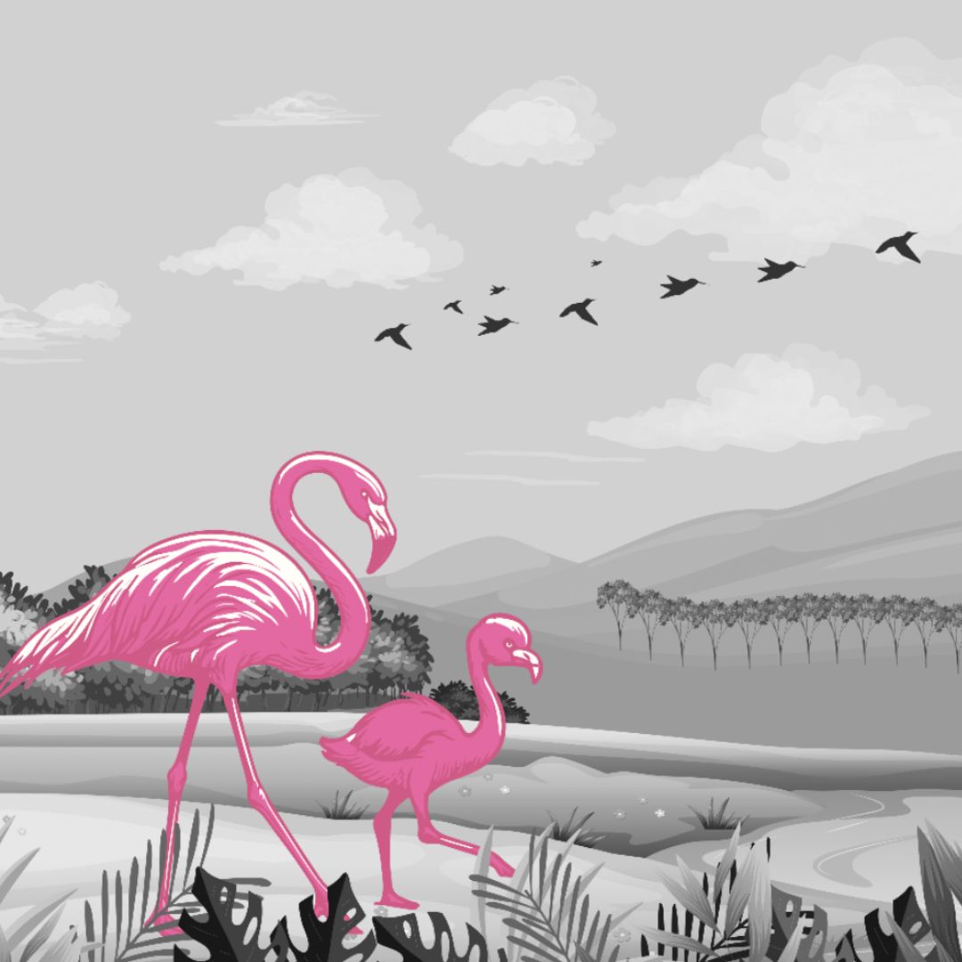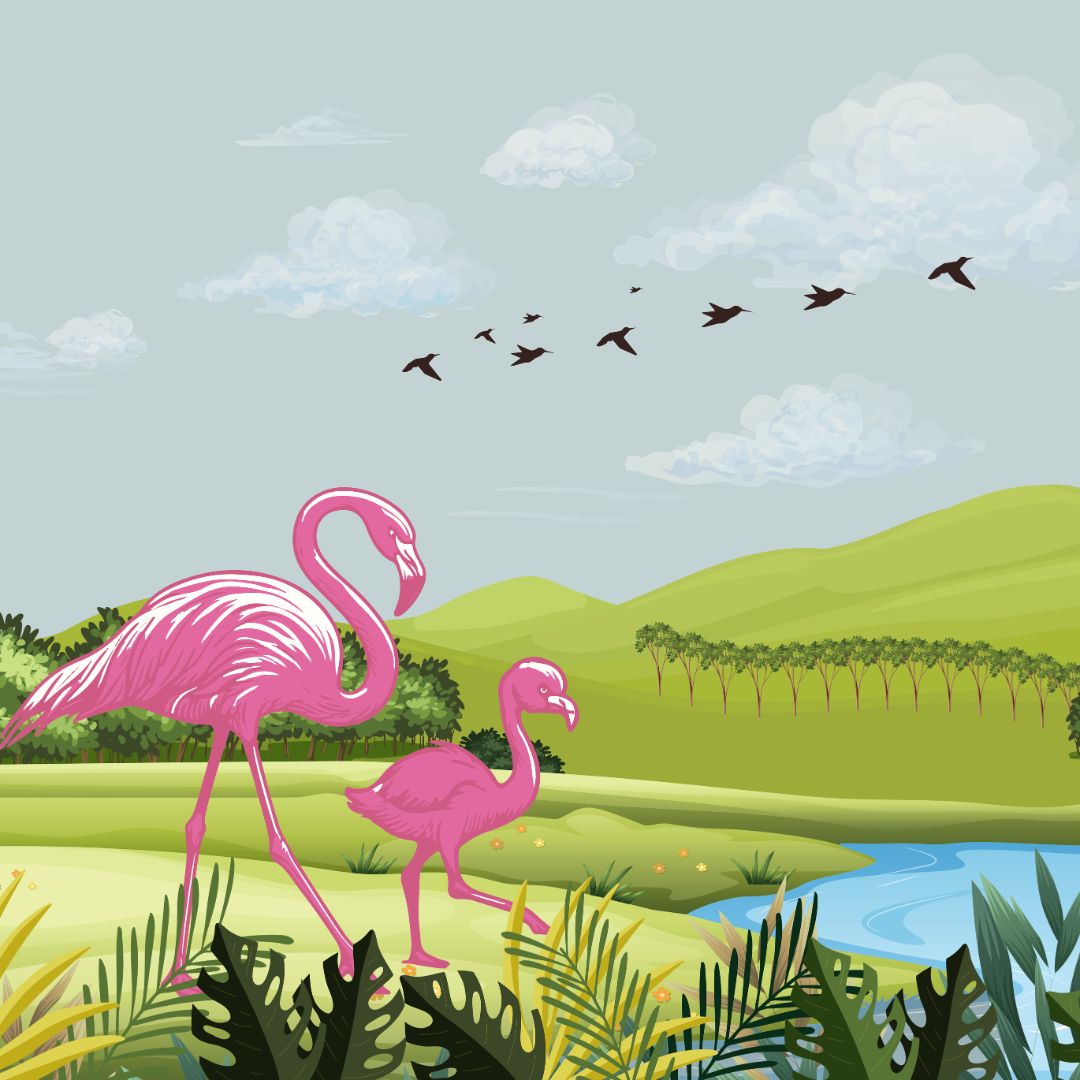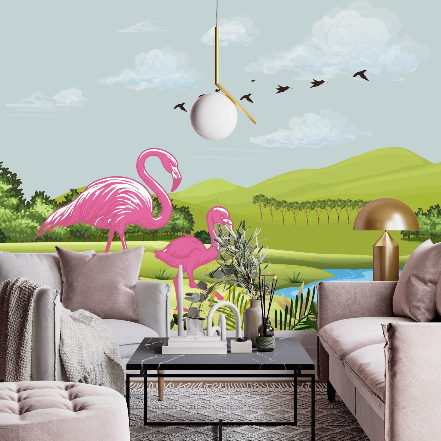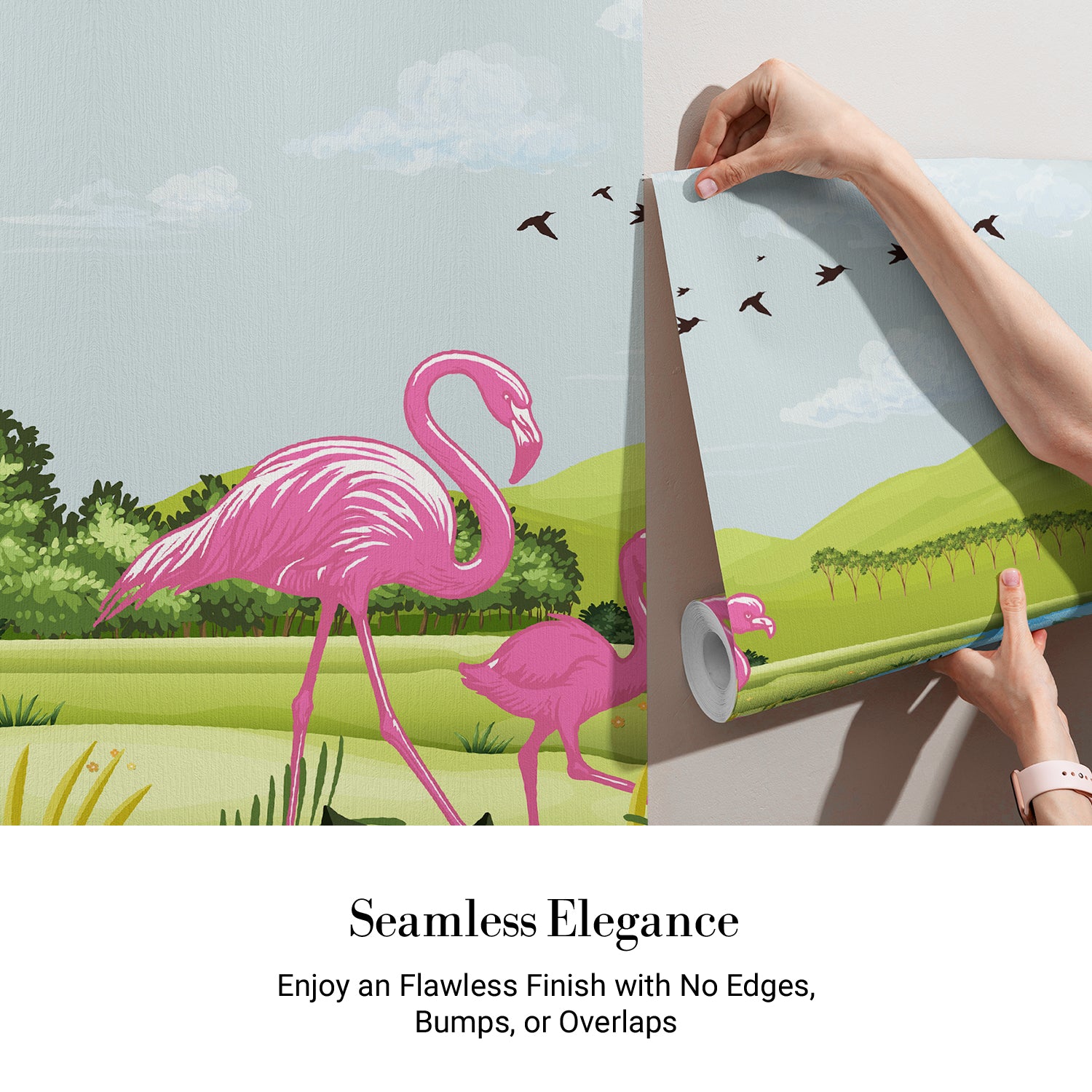 Bring the joy of nature indoors with this vibrant wallpaper featuring charming flamingos by a serene lake. Perfect for kids' rooms, this tropical design adds a touch of fun, color, and freshness to any space.