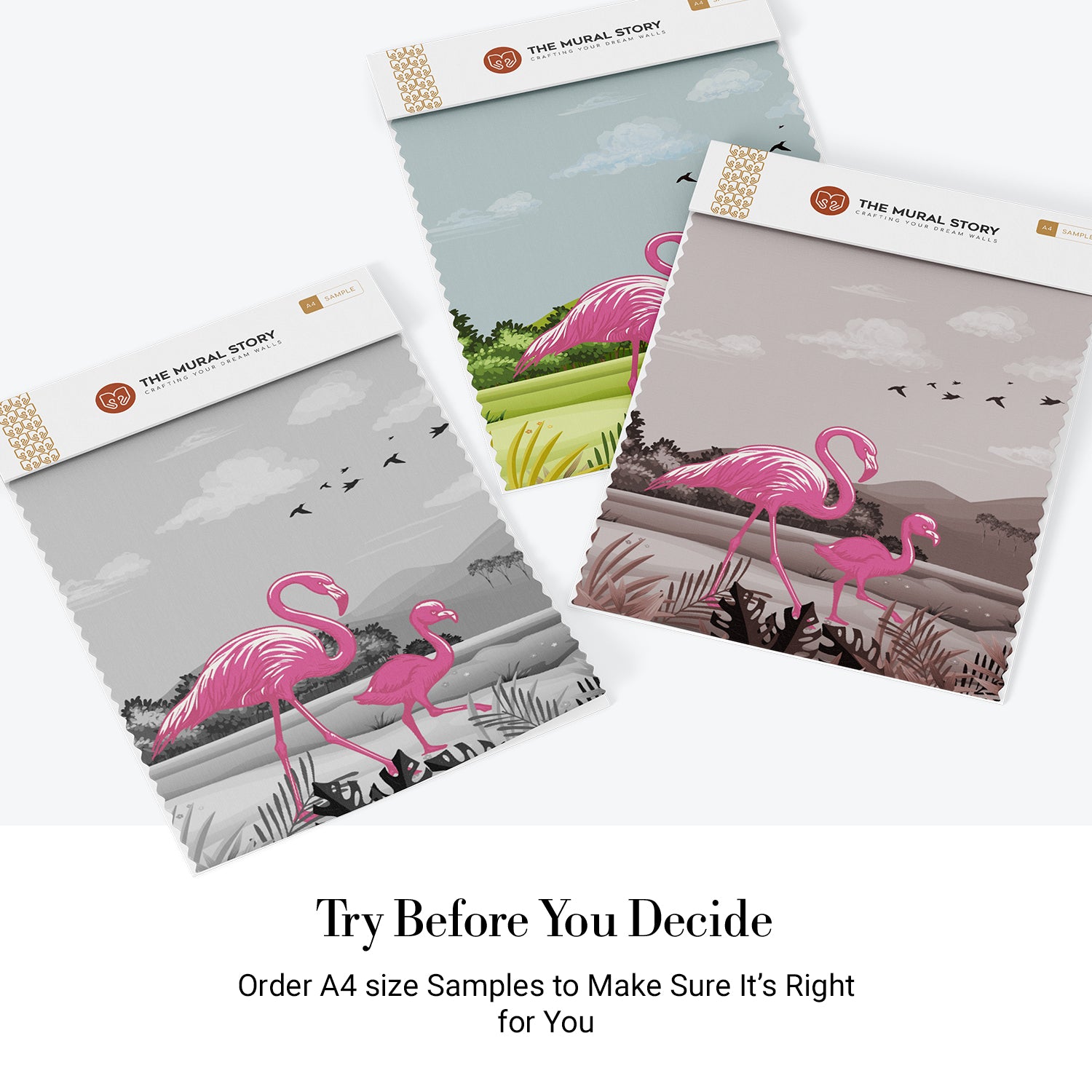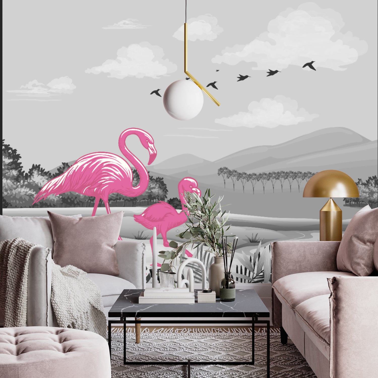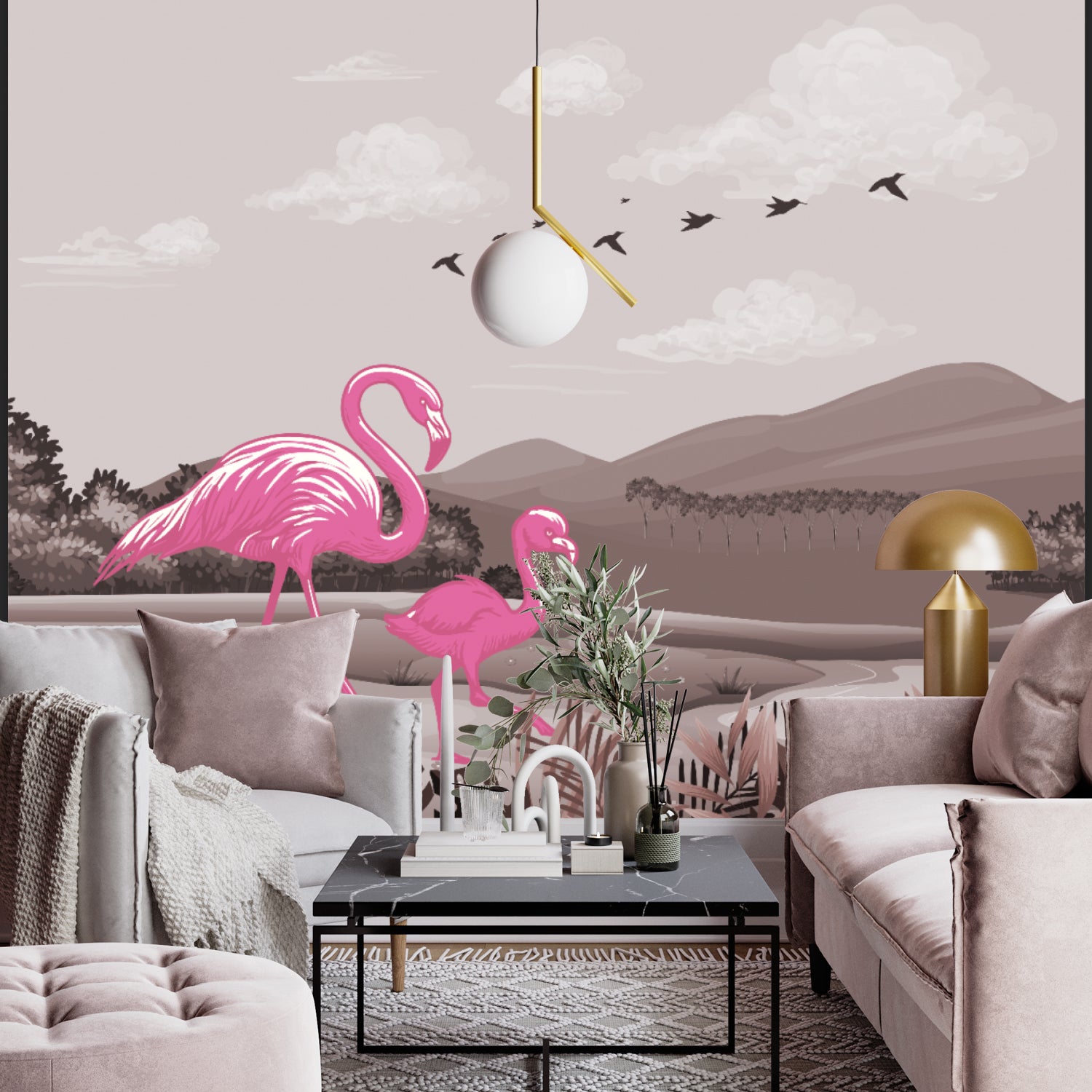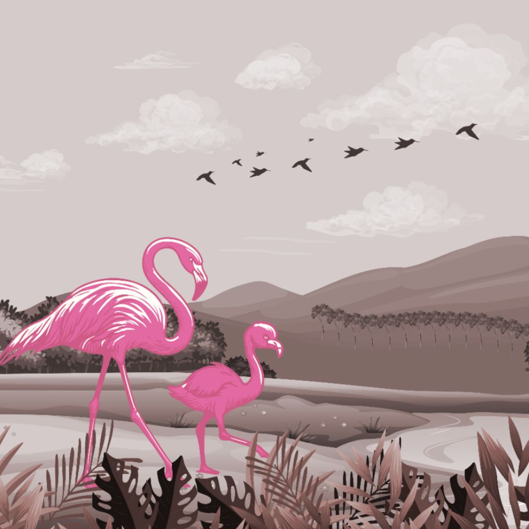 Bring the joy of nature indoors with this vibrant wallpaper featuring charming flamingos by a serene lake. Perfect for kids' rooms, this tropical design adds a touch of fun, color, and freshness to any space.
