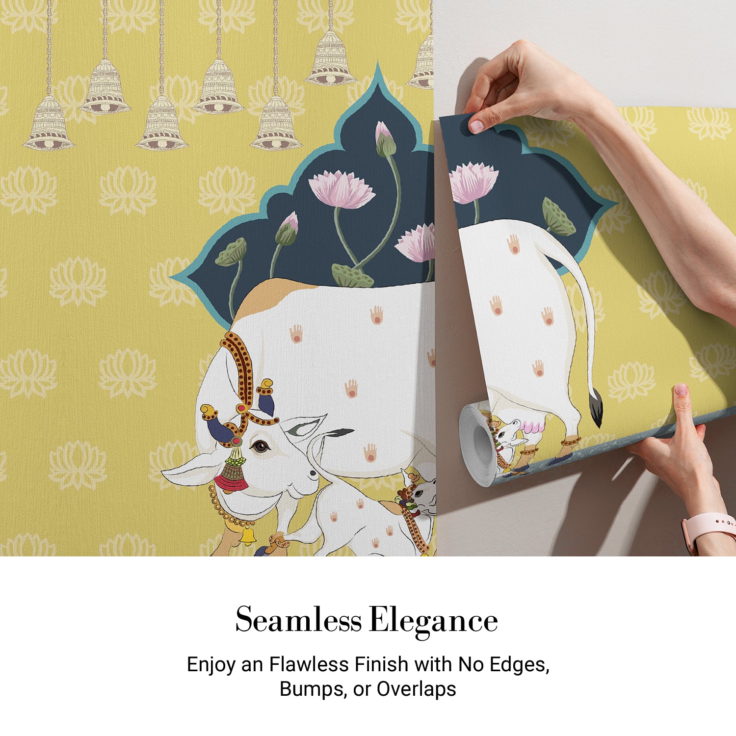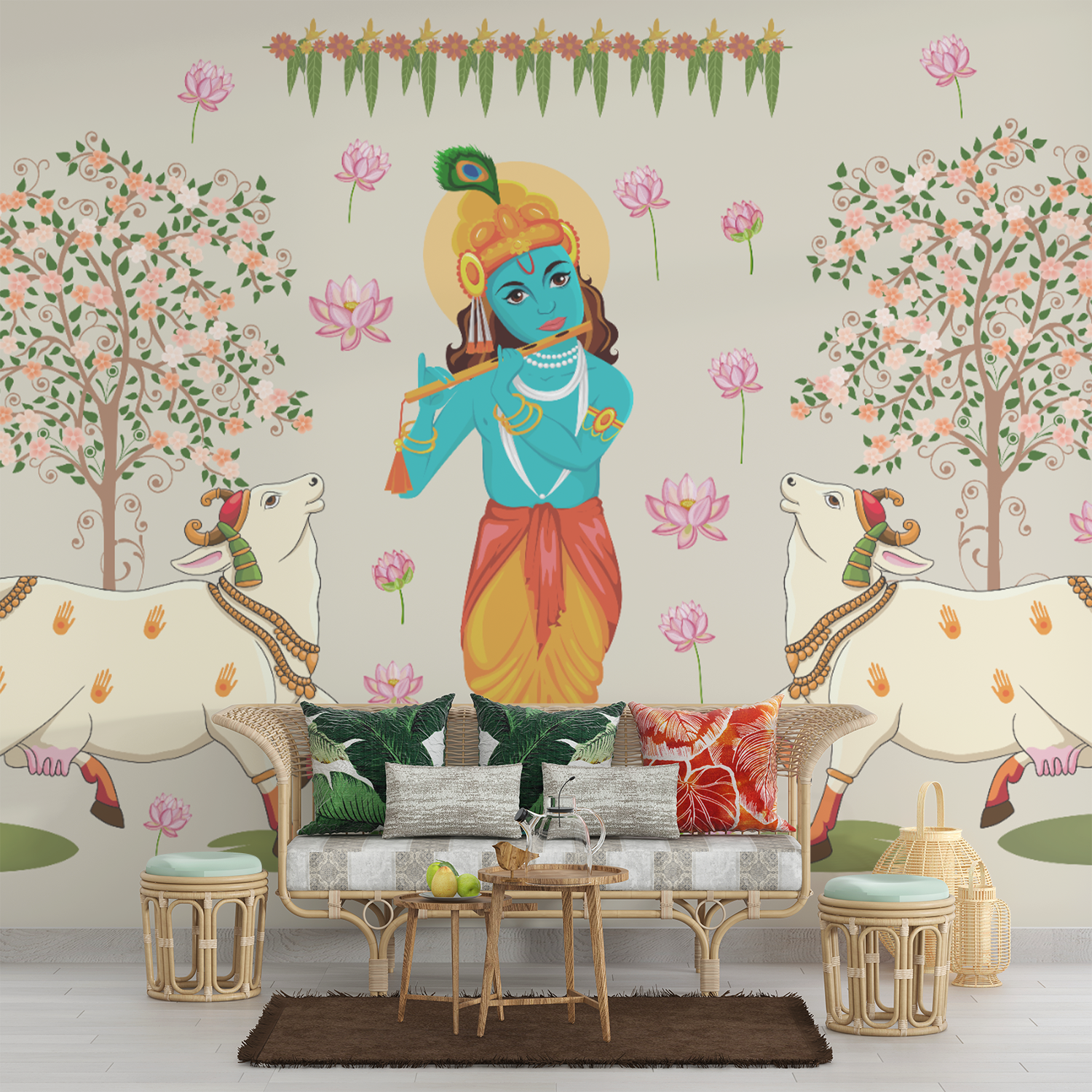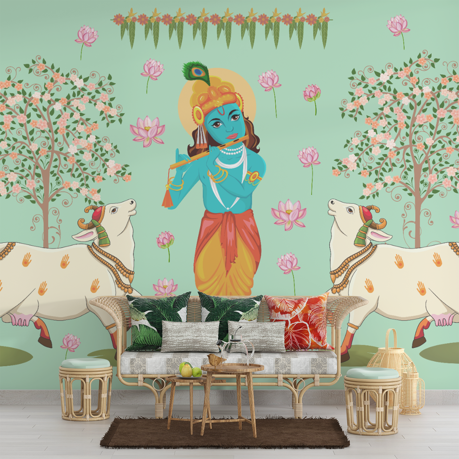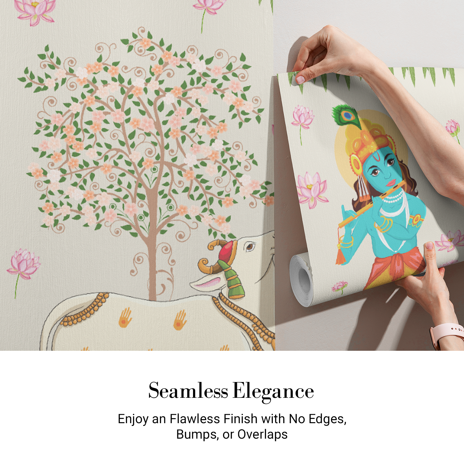 Infuse your Pooja room with a serene and spiritual ambiance using our The Mural Story Pooja Room Wallpapers. Our collection features a vast range of designs, including traditional Pichwai murals, intricate floral patterns, geometric motifs, and beautiful depictions of deities. These wallpapers are crafted to bring joy, happiness, and a deep sense of peace to your sacred space, adding a touch of tradition and spirituality to your home.