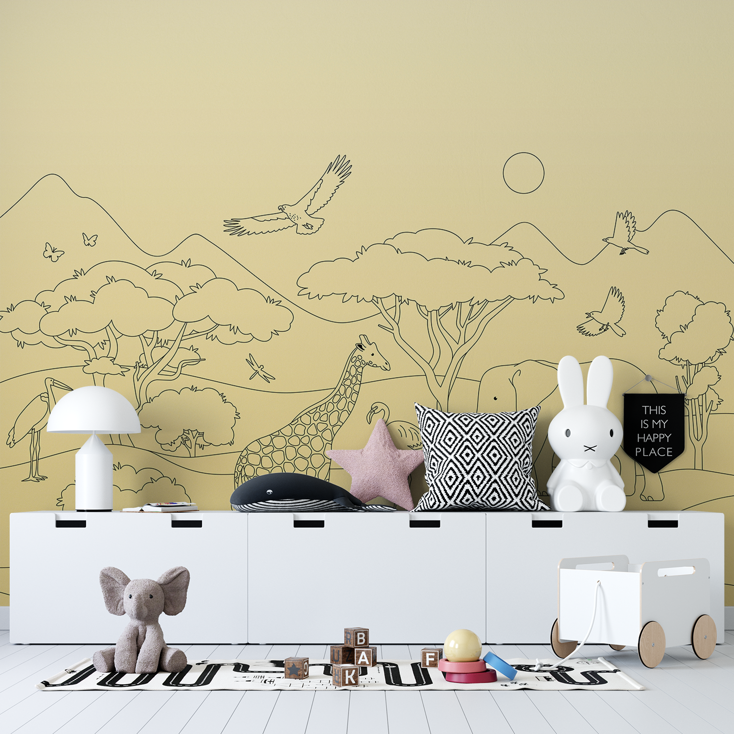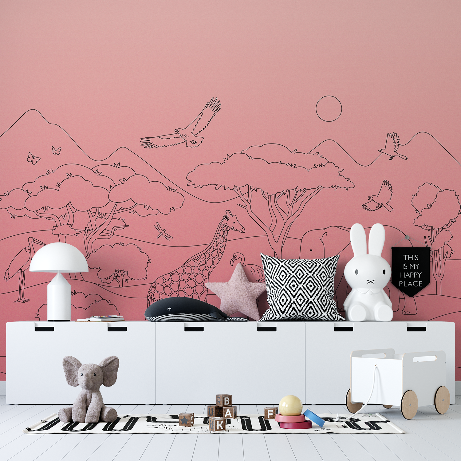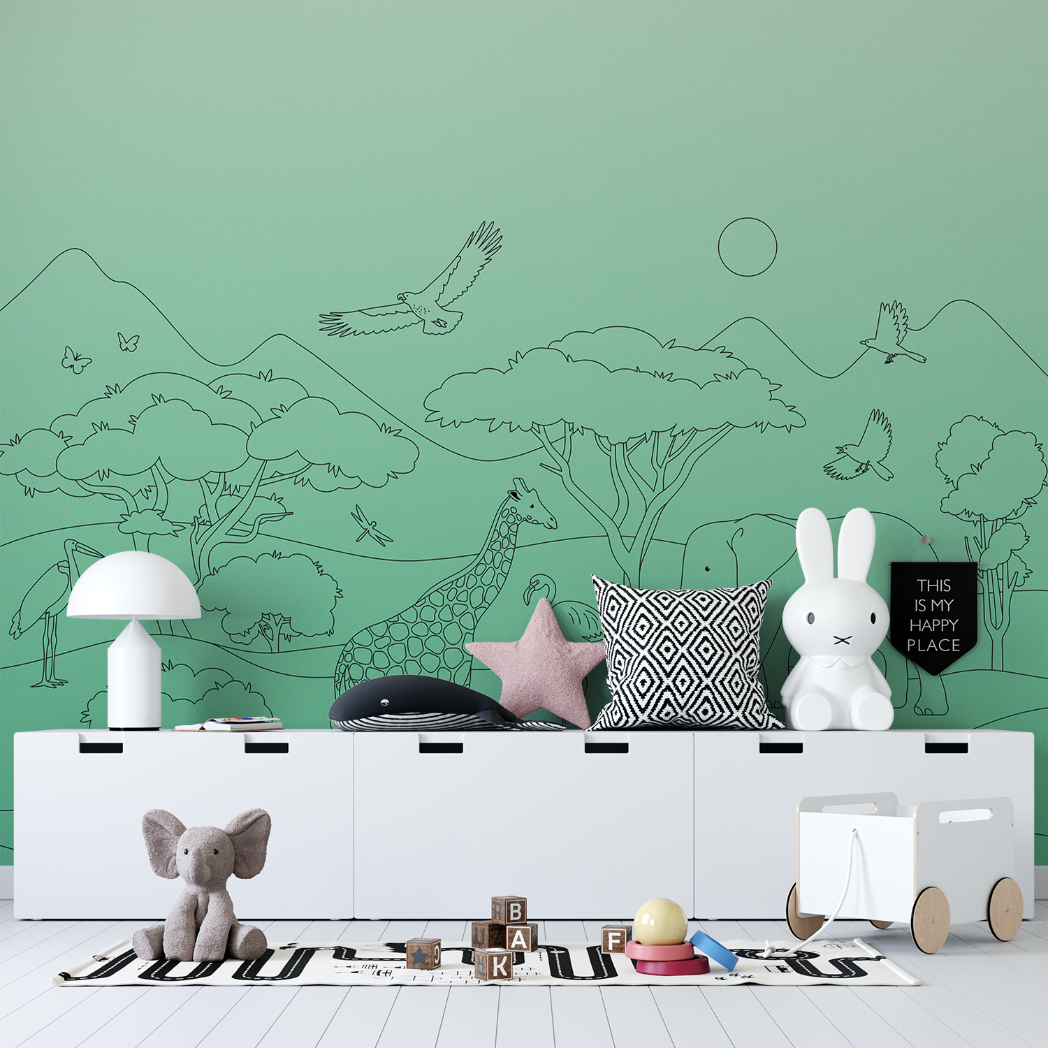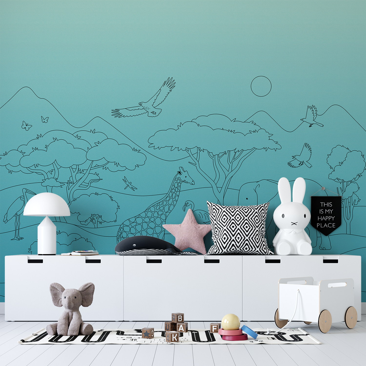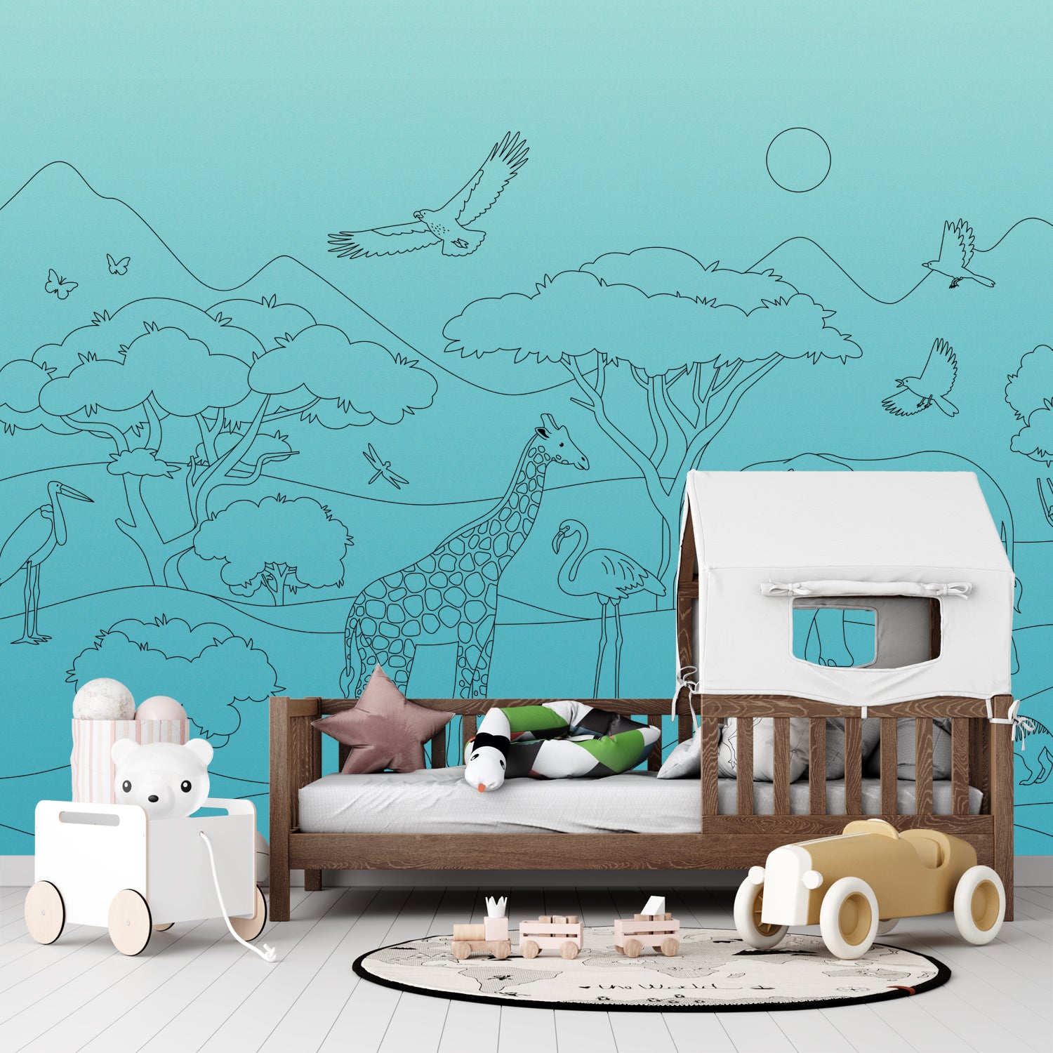 Drag the slider to see the stunning transformation of your room as our wallpaper turns featureless walls into colourful canopies of fun & wonder.