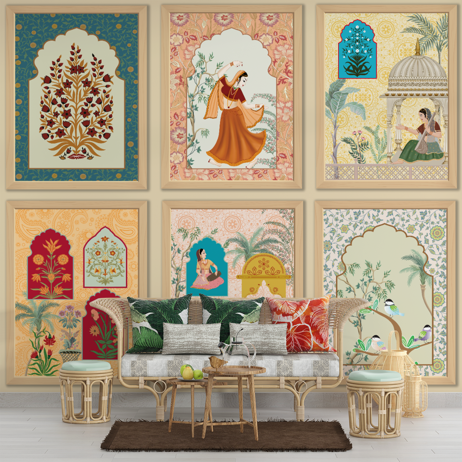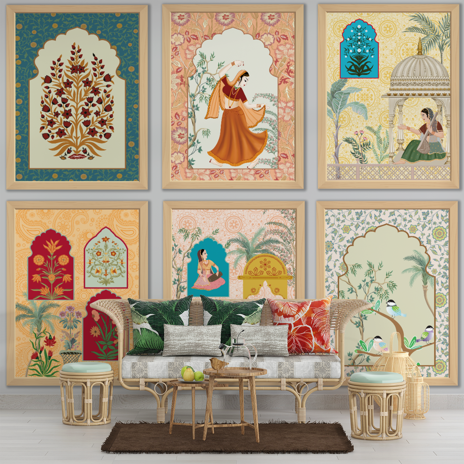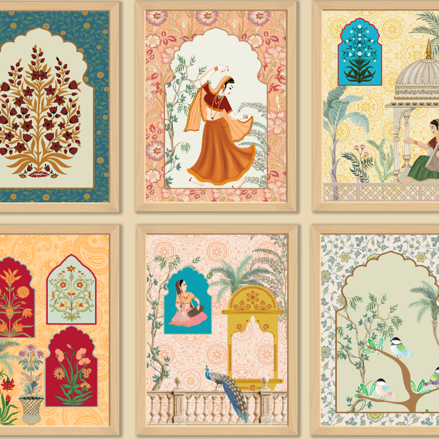 Celebrate India’s royal legacy with this stunning series of Mughal-style wall panels. Each frame showcases women in graceful poses, floral arrangements, peacocks, and archway windows, reminiscent of miniature art from palaces of Rajasthan. A perfect blend of color, heritage, and elegance, this design brings timeless sophistication and a curated touch of classical luxury to interiors.