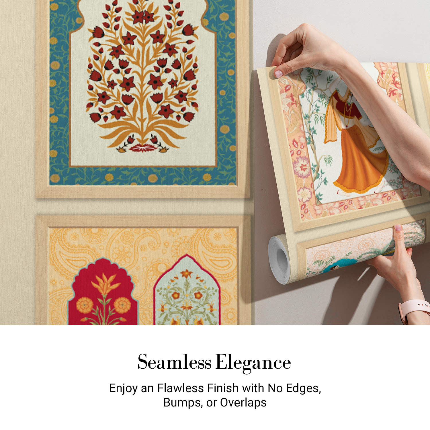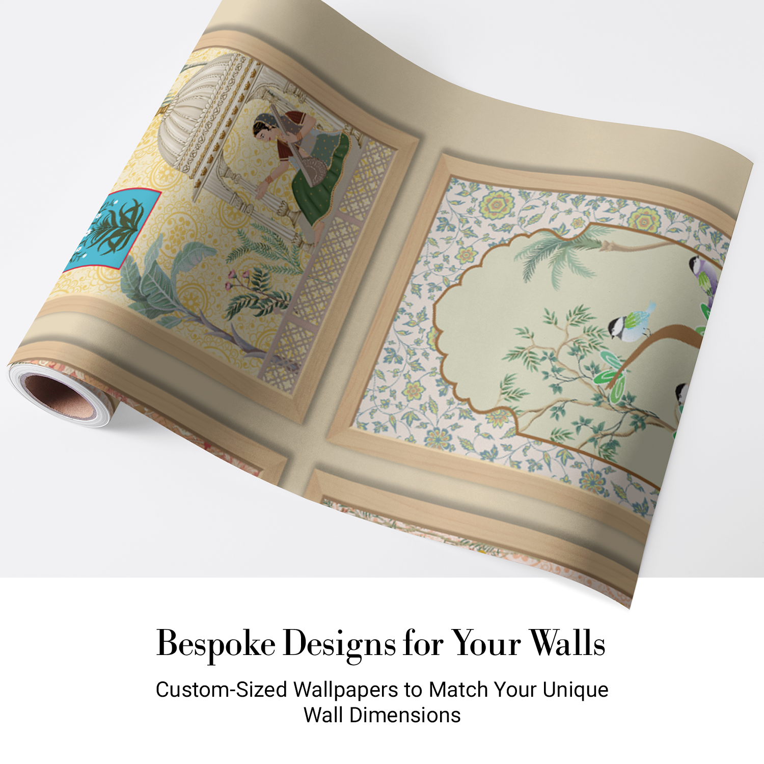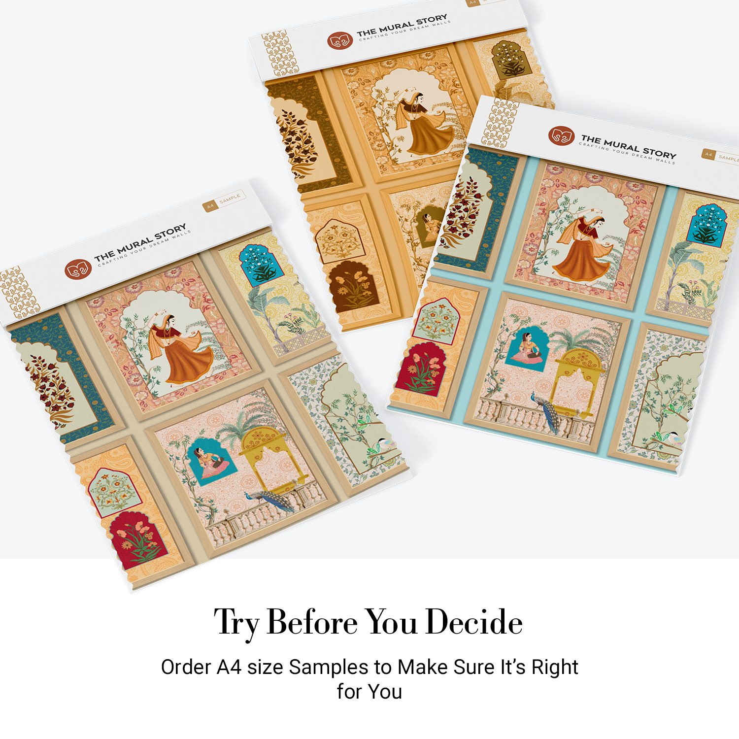 Celebrate India’s royal legacy with this stunning series of Mughal-style wall panels. Each frame showcases women in graceful poses, floral arrangements, peacocks, and archway windows, reminiscent of miniature art from palaces of Rajasthan. A perfect blend of color, heritage, and elegance, this design brings timeless sophistication and a curated touch of classical luxury to interiors.