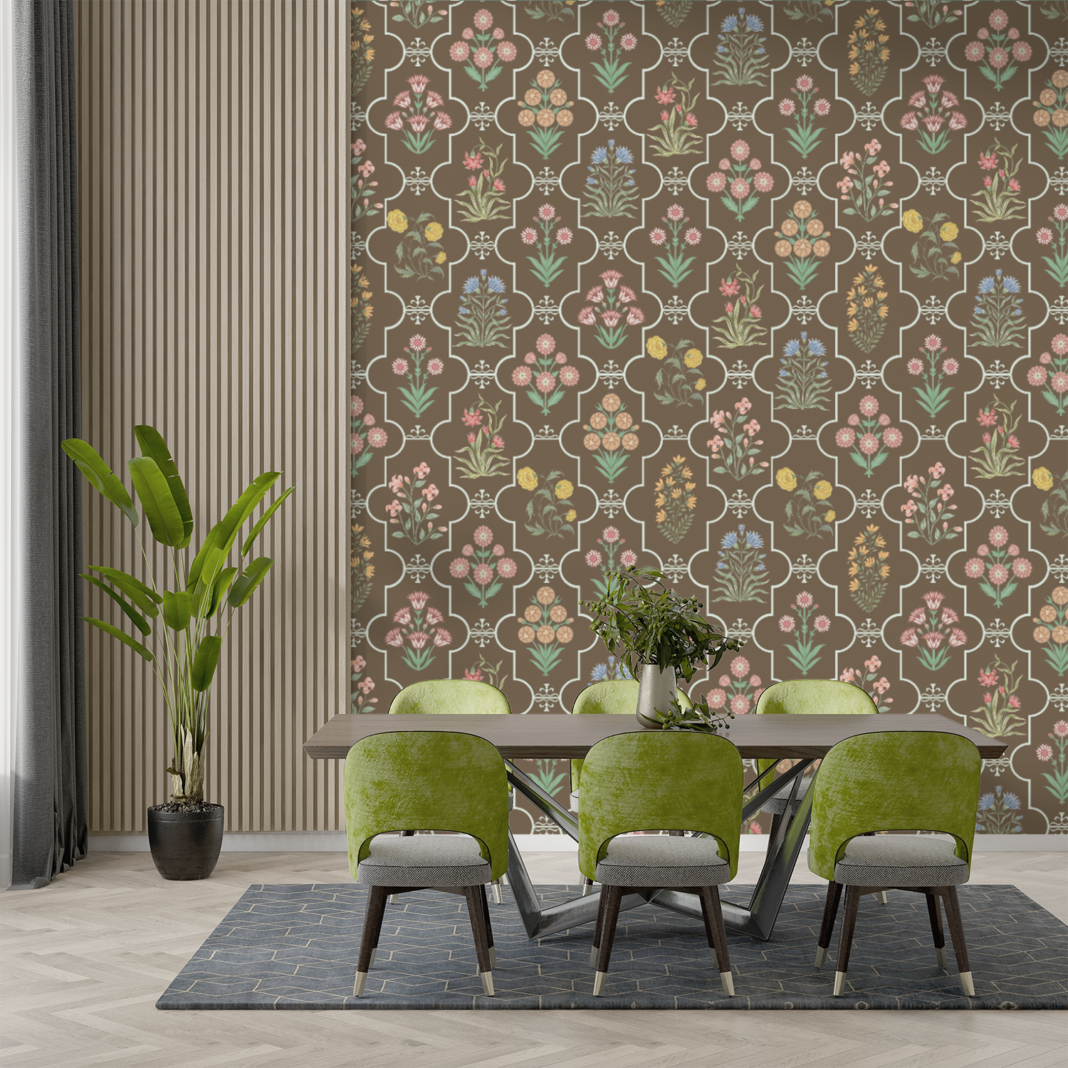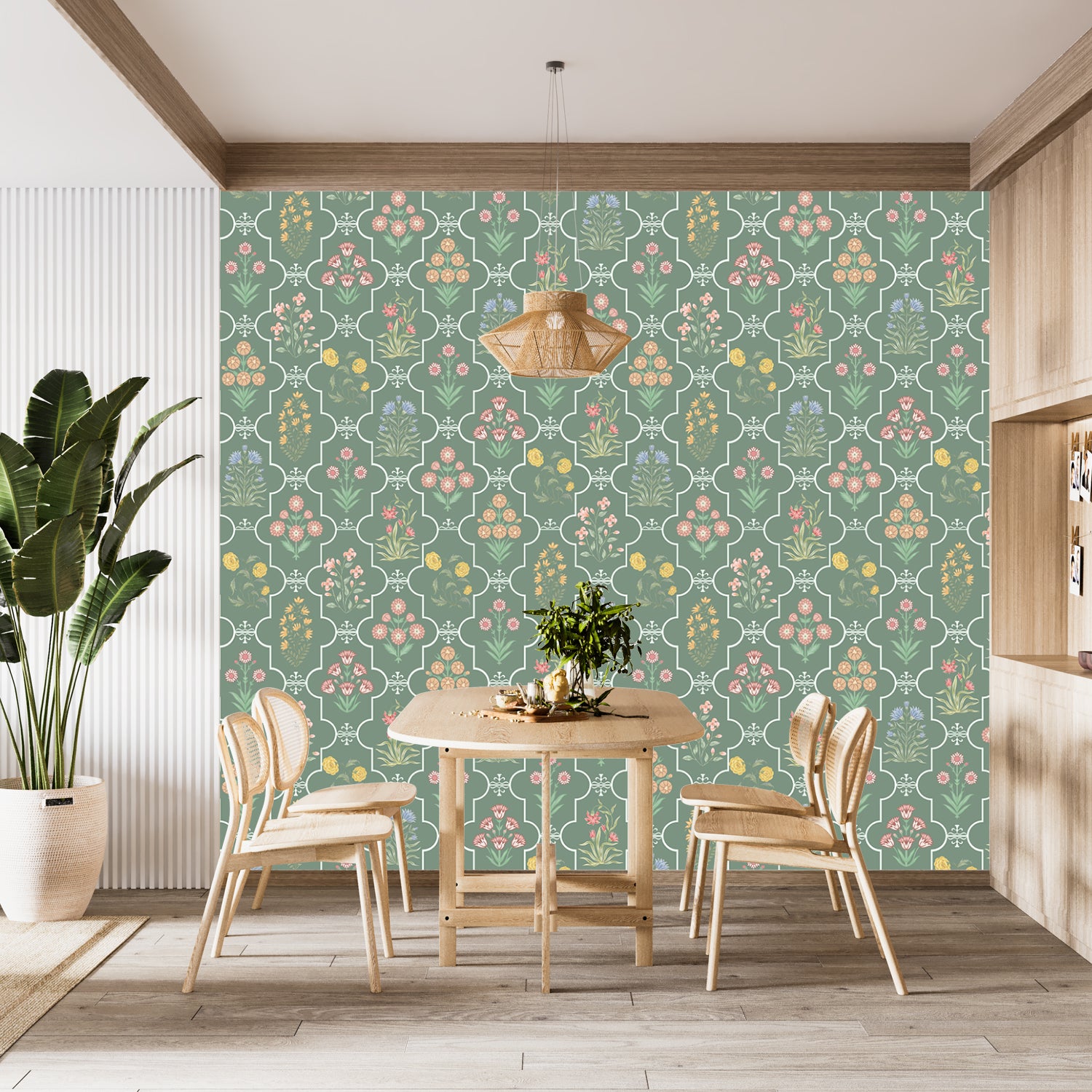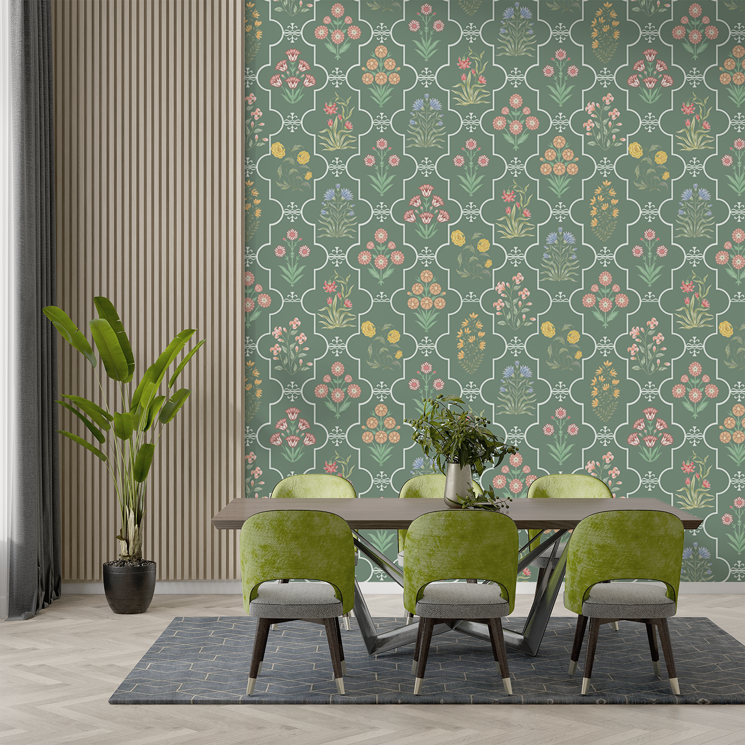 Inspired by Mughal gardens, this wallpaper features a symmetrical floral arrangement in soft green hues. Perfect for elegant dining rooms, artistic cafes, or heritage-inspired interiors.