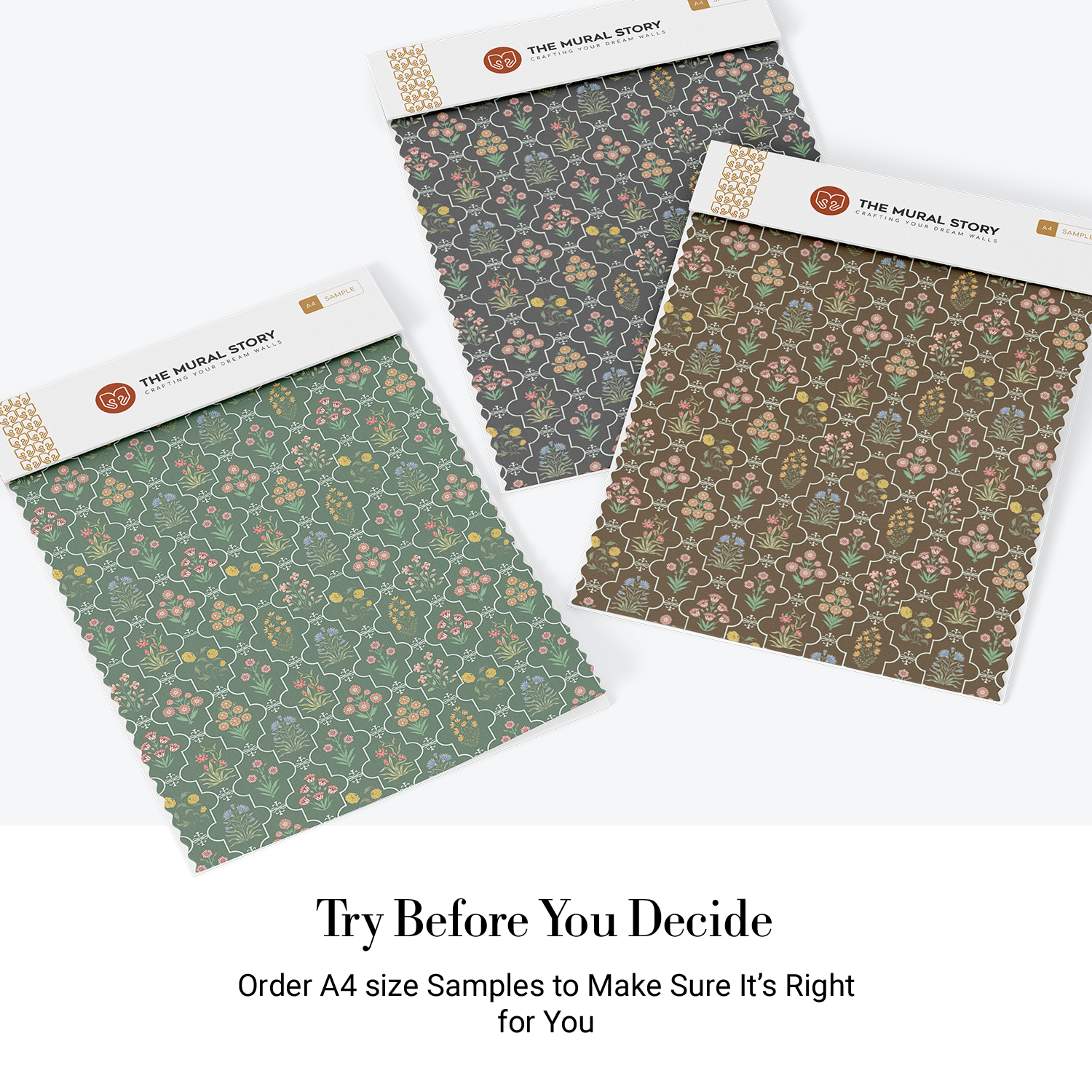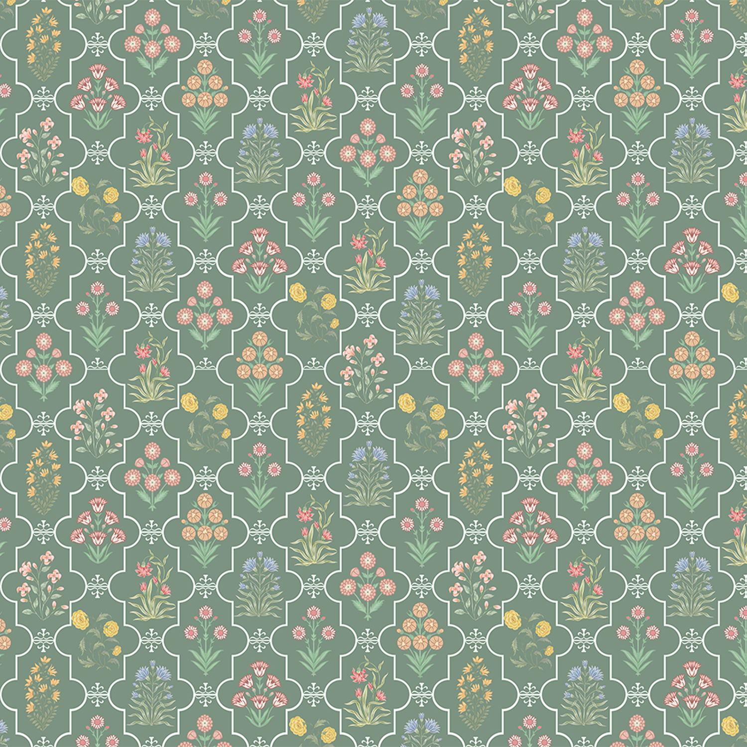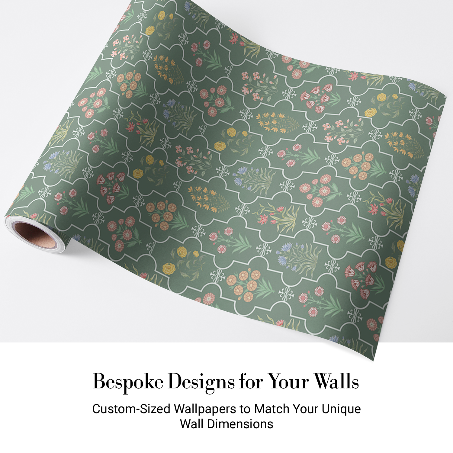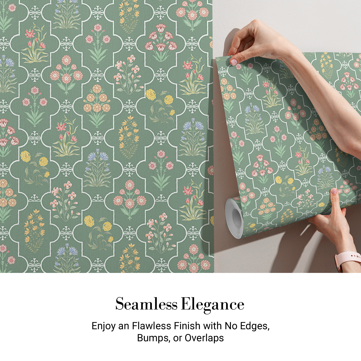 Inspired by Mughal gardens, this wallpaper features a symmetrical floral arrangement in soft green hues. Perfect for elegant dining rooms, artistic cafes, or heritage-inspired interiors.