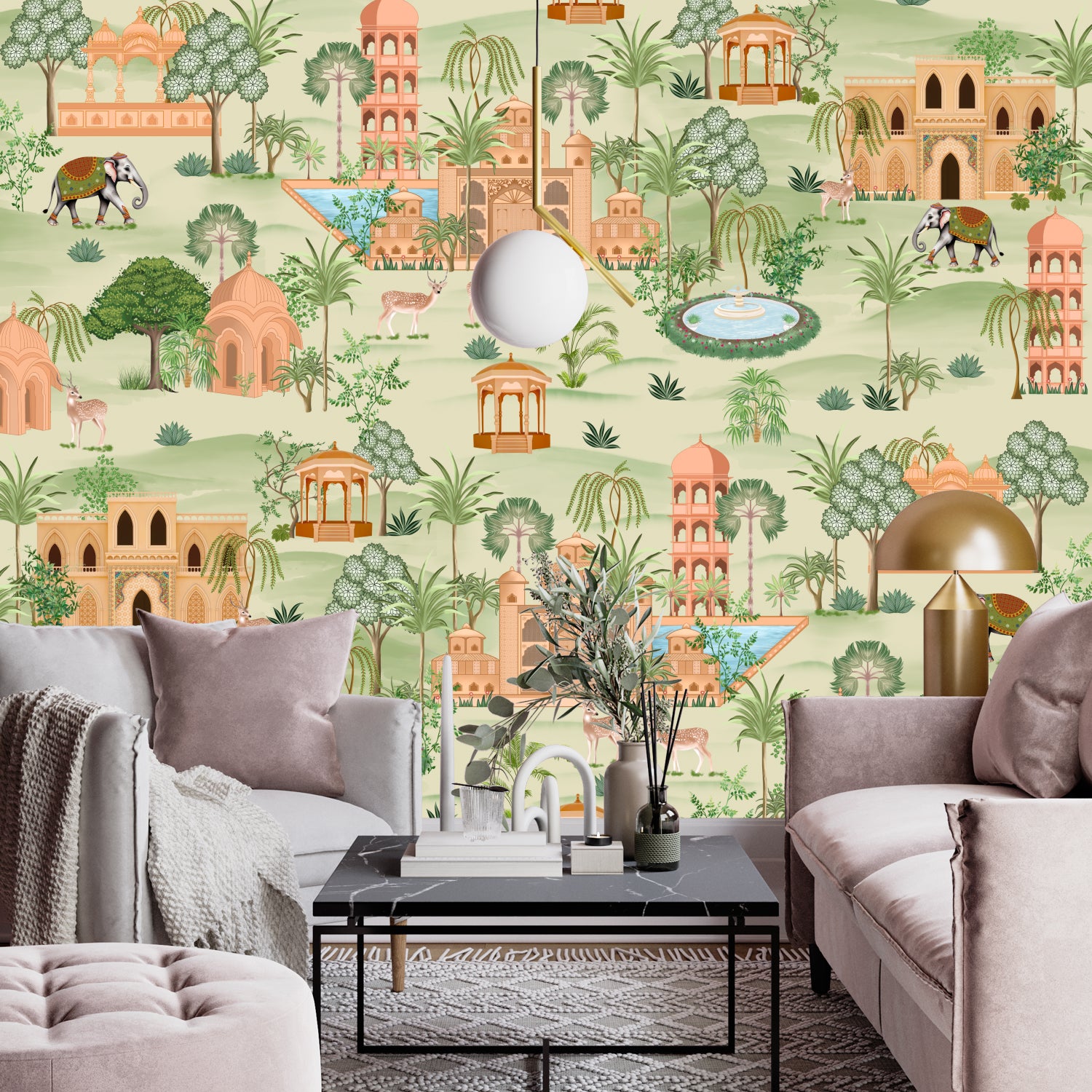 Immerse your room in the grandeur of Mughal heritage with this scenic wallpaper, featuring intricate architectural elements, verdant gardens, and lively wildlife. With motifs of majestic buildings, serene water fountains, horses, and deer, this design creates a nostalgic yet elegant ambiance. Perfect for spaces that seek a refined, cultural touch, making every glance a journey through history.