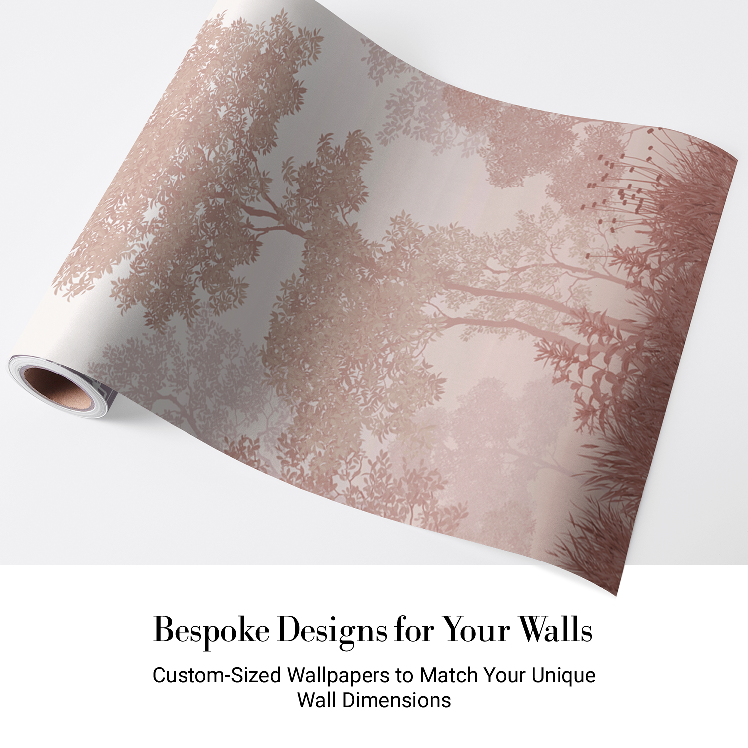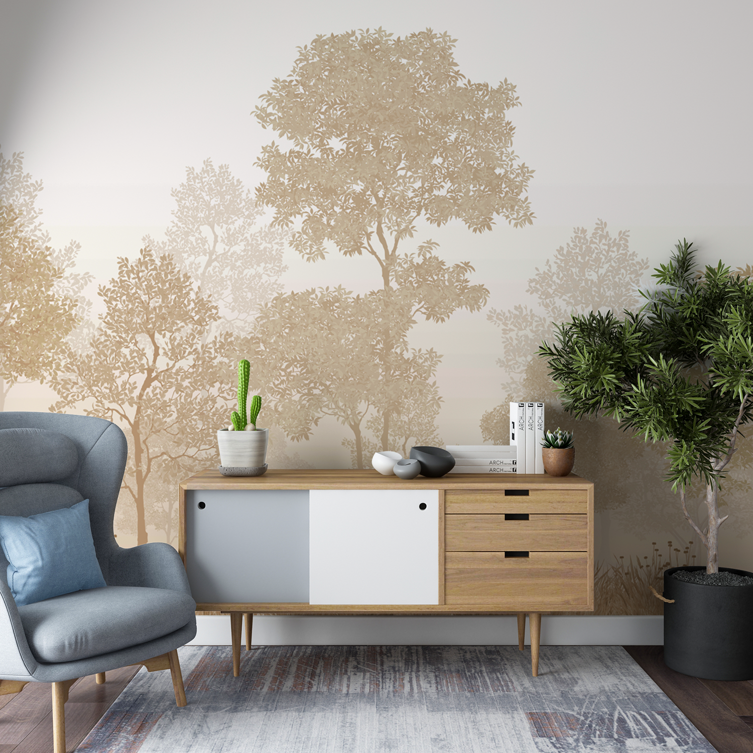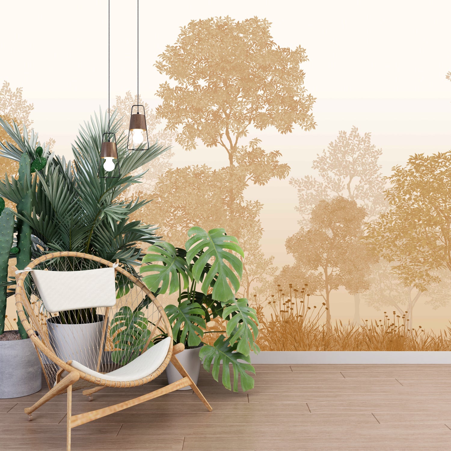 A mystical depiction of nature’s embrace, this wallpaper features soft, earthy-hued trees enveloped in golden mist. The fading silhouettes add a sense of depth, mystery, and calm. Ideal for nature-inspired interiors, wellness spaces, or cozy living areas. The warm and neutral palette ensures it blends seamlessly into contemporary and classic decor.