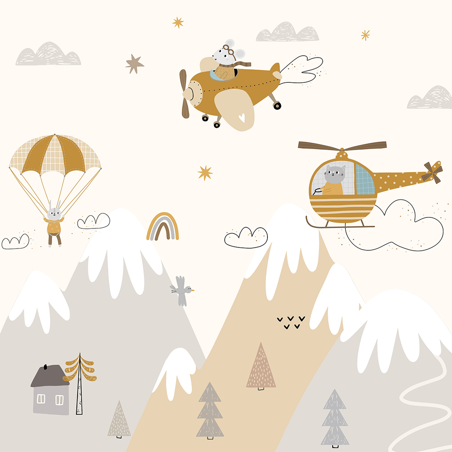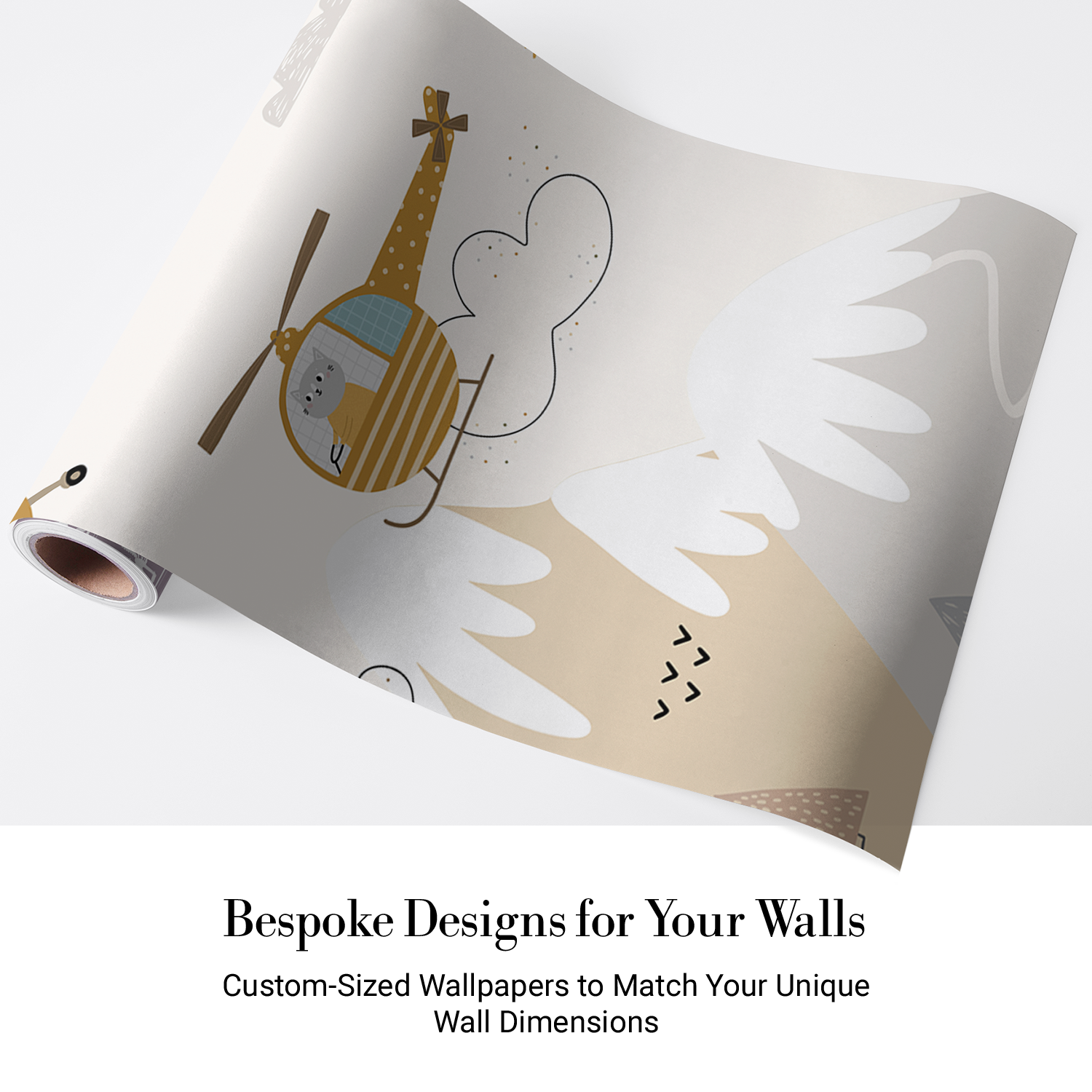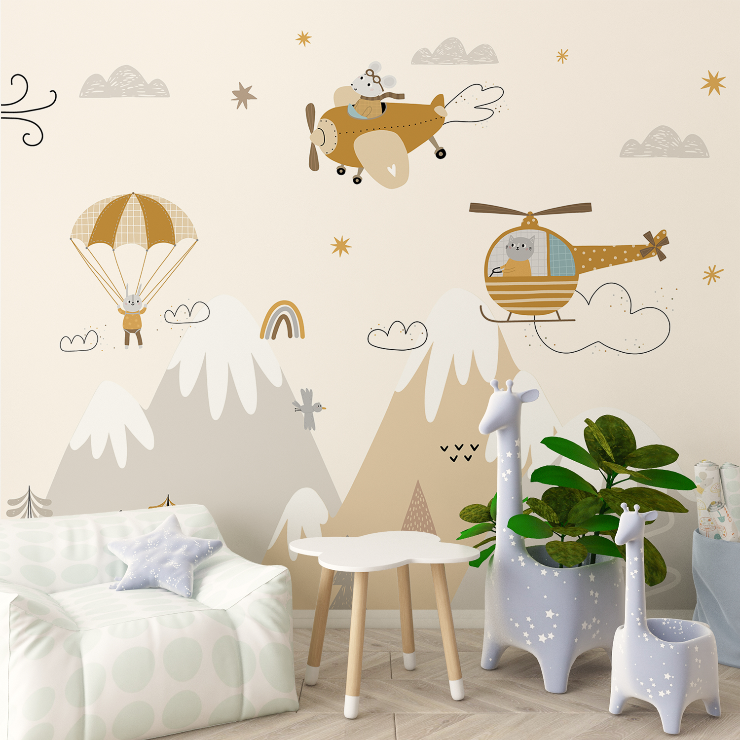A delightful kids' wallpaper featuring adventurous animal pilots navigating through a sky of hot air balloons and helicopters. Designed in soft, earthy tones, this theme sparks creativity and joy, making it a perfect choice for nurseries, playrooms, and learning spaces.