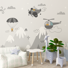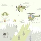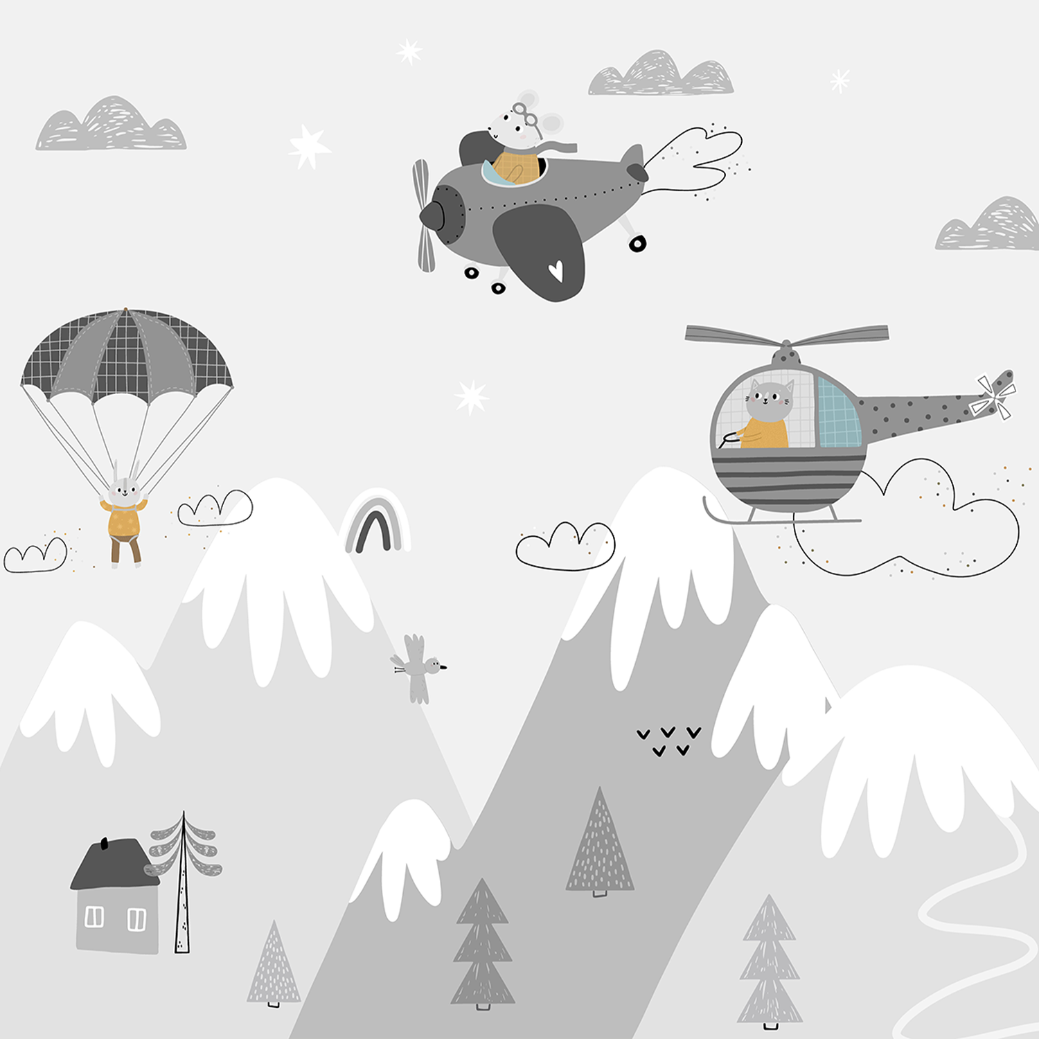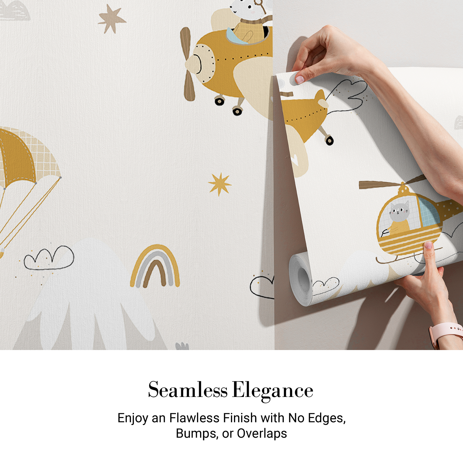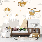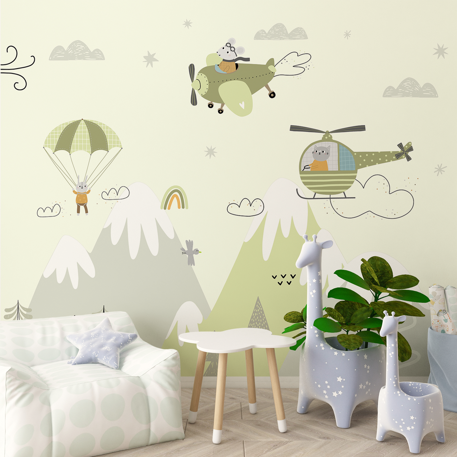 A delightful kids' wallpaper featuring adventurous animal pilots navigating through a sky of hot air balloons and helicopters. Designed in soft, earthy tones, this theme sparks creativity and joy, making it a perfect choice for nurseries, playrooms, and learning spaces.
