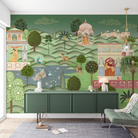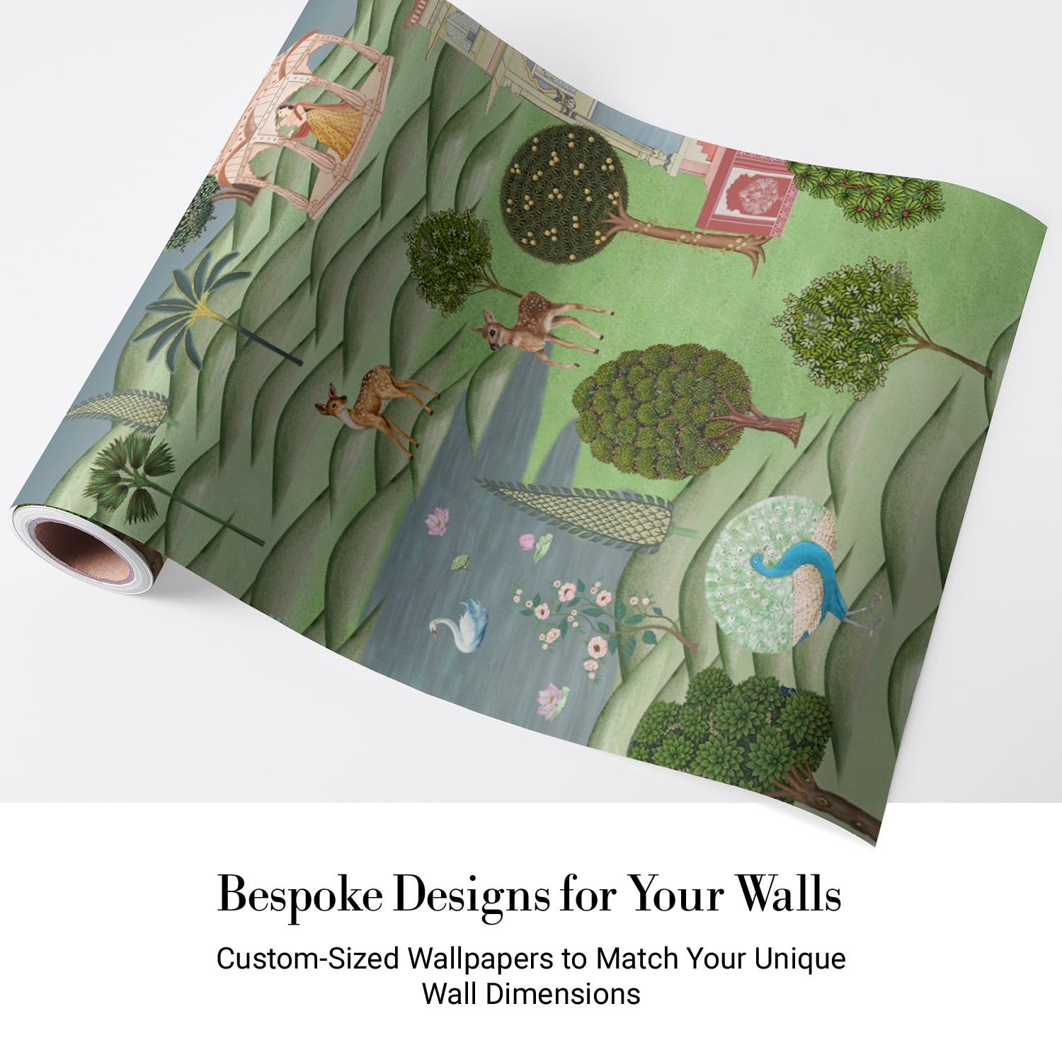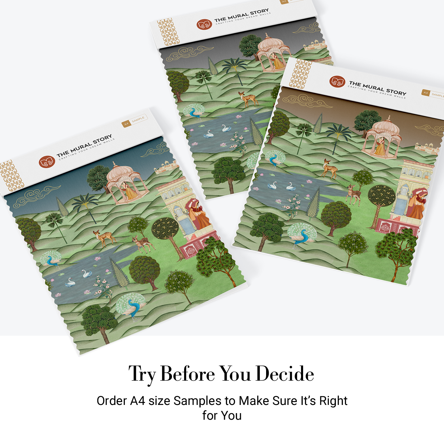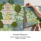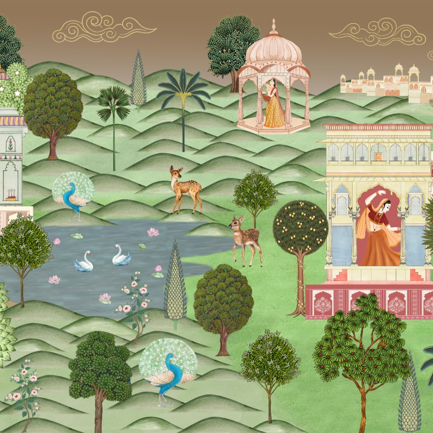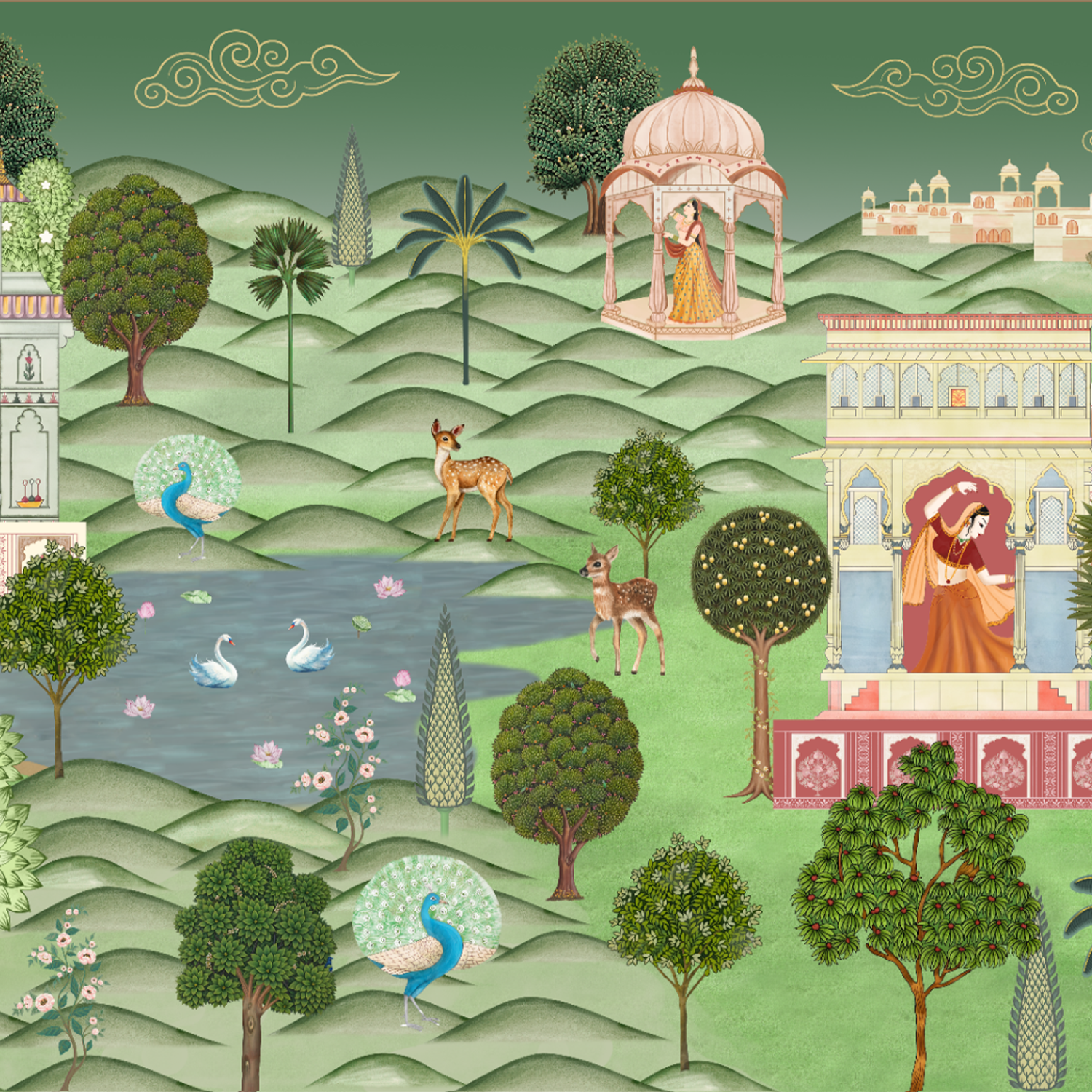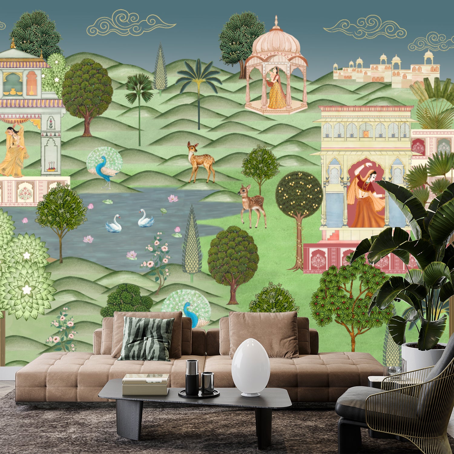 Transform your space with our enchanting Indian-inspired mural featuring elegant pavilions, ornate architecture, and serene landscapes. This artistic scene showcases figures in traditional attire, peacocks, deer, and lotus-filled ponds against rolling green hills and a teal sky with decorative clouds. Perfect for creating a sophisticated focal point in dining rooms, reading nooks, or meditation spaces.